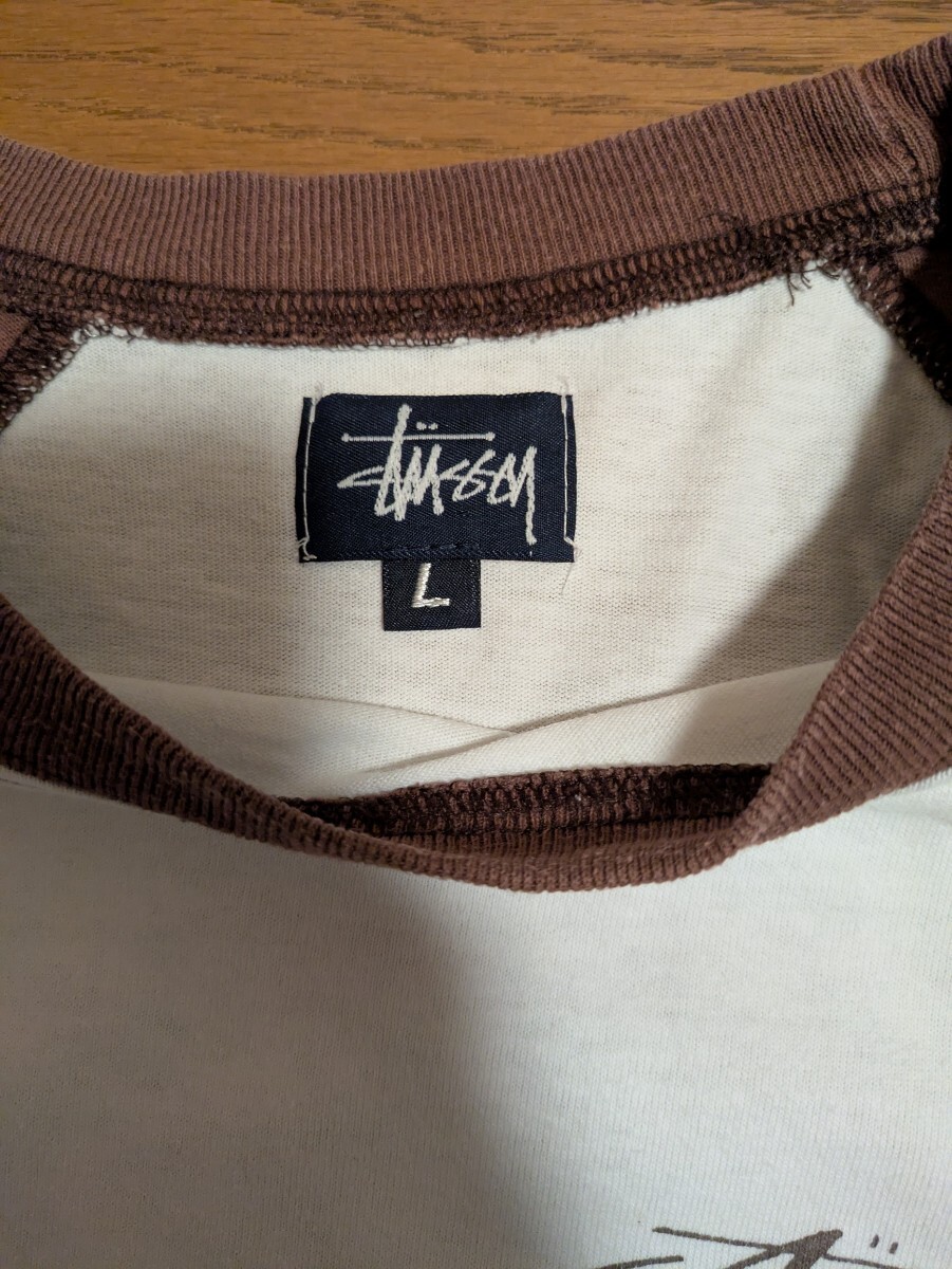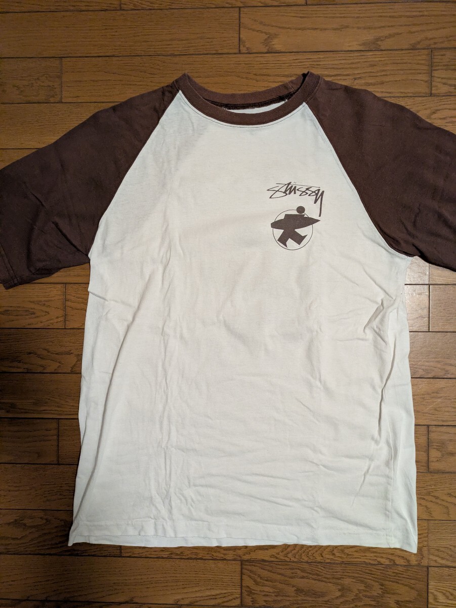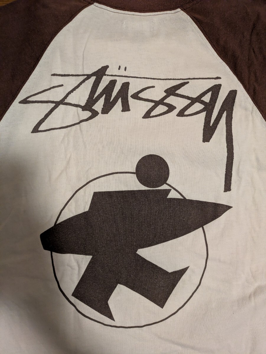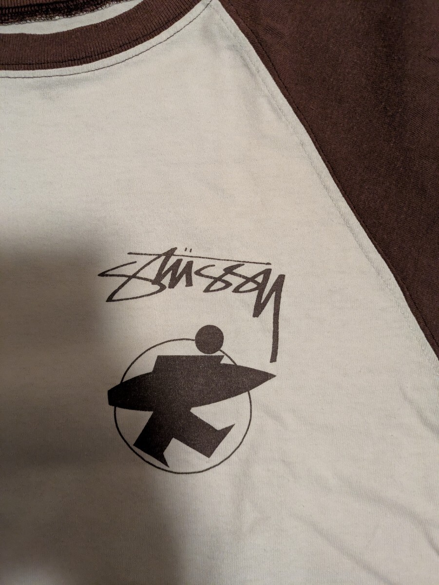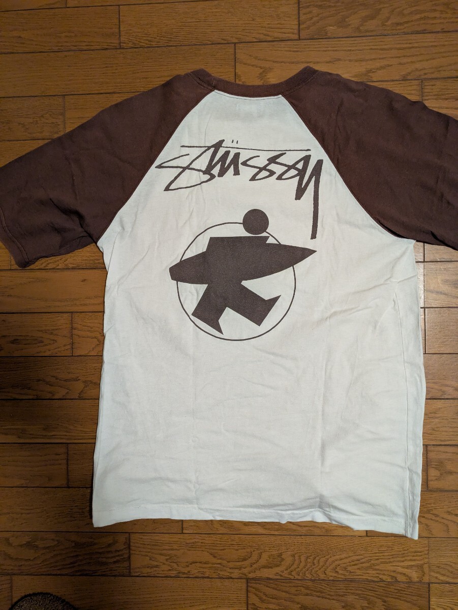 StussyのラグランスリーブTシャツ、ブラウンとホワイトの配色で、サーフマンロゴが特徴。