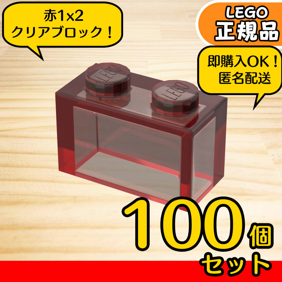 LEGO 赤 クリア 1×2 ブロック 100個/未使用,正規品,匿名配送,送料無料