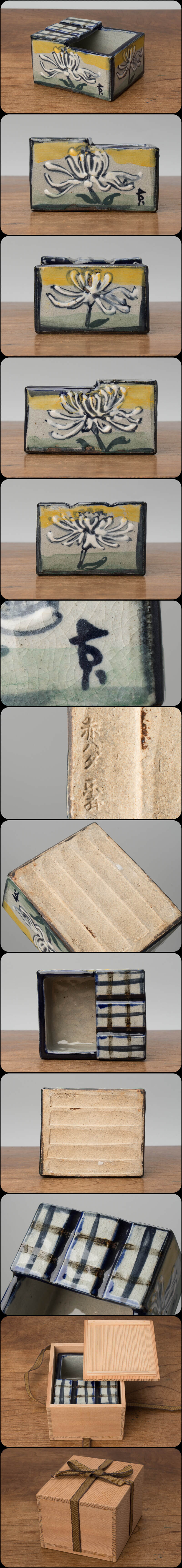 | 鍋井克之絵付けの灰皿。合箱有。真作保証。 絵付は鍋井克之の手描きで、陶器の制作は赤膚焼の尾西楽斎。 鍋井克之作品を収集されていた方の持ち物で、当店では20点ほどまとめて 仕入れました。 サイズは、幅約11.5x13.5cm、高さ約7.5cm。 縁にわずかなスレあります。 状態・詳細は、画像でご確認お願いいたします。 |