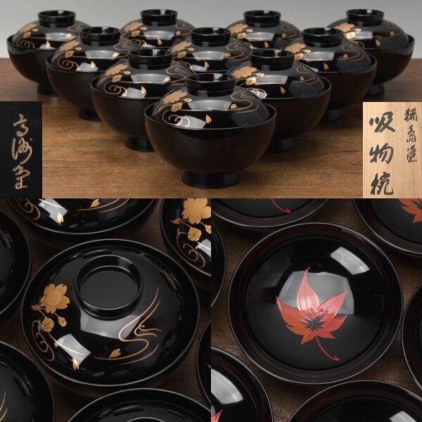 | 輪島塗、大向高洲堂の吸物椀10客(5客×2箱)。木箱有。真作保証。 もちろん、本木地・本漆塗で、本金等を用いた手描きの蒔絵・漆絵です。 サイズは、幅約12cm、高さ約9.5cm(蓋込み)。 10客とも状態は良好です。 傷・直し・ヤケ・歪み等ありません。 新品ではありませんので、僅かなスレ程度はご承知の上でお願いします。 状態・詳細は、画像でご確認お願いいたします。 |