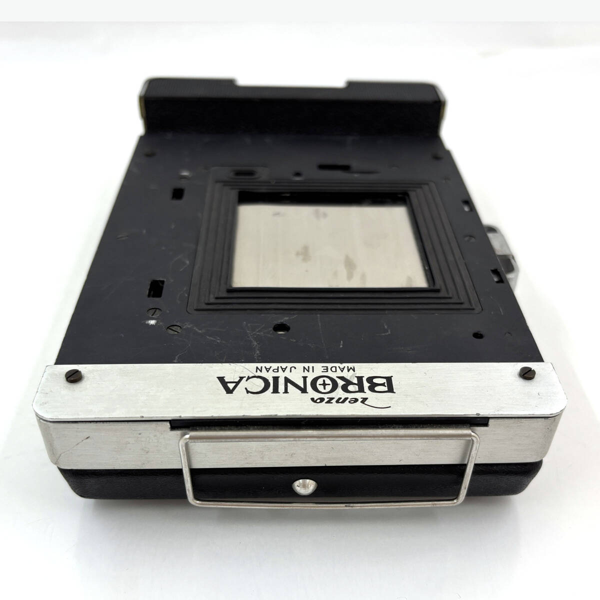 BRONICA POLAROID フィルムホルダーは、撮影後すぐにポラロイドフィルムで確認ができる便利なアクセサリーです。スタジオ撮影やライティングチェックに用いられ、プロフェッショナルに重宝されました。