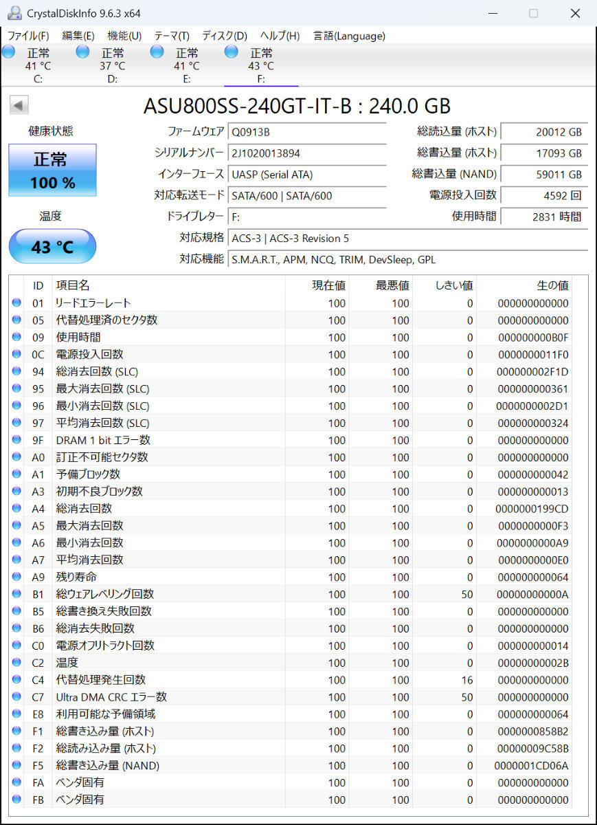 | SATA ADATA SSD SU800 240GB / 使用時間 2831 | |