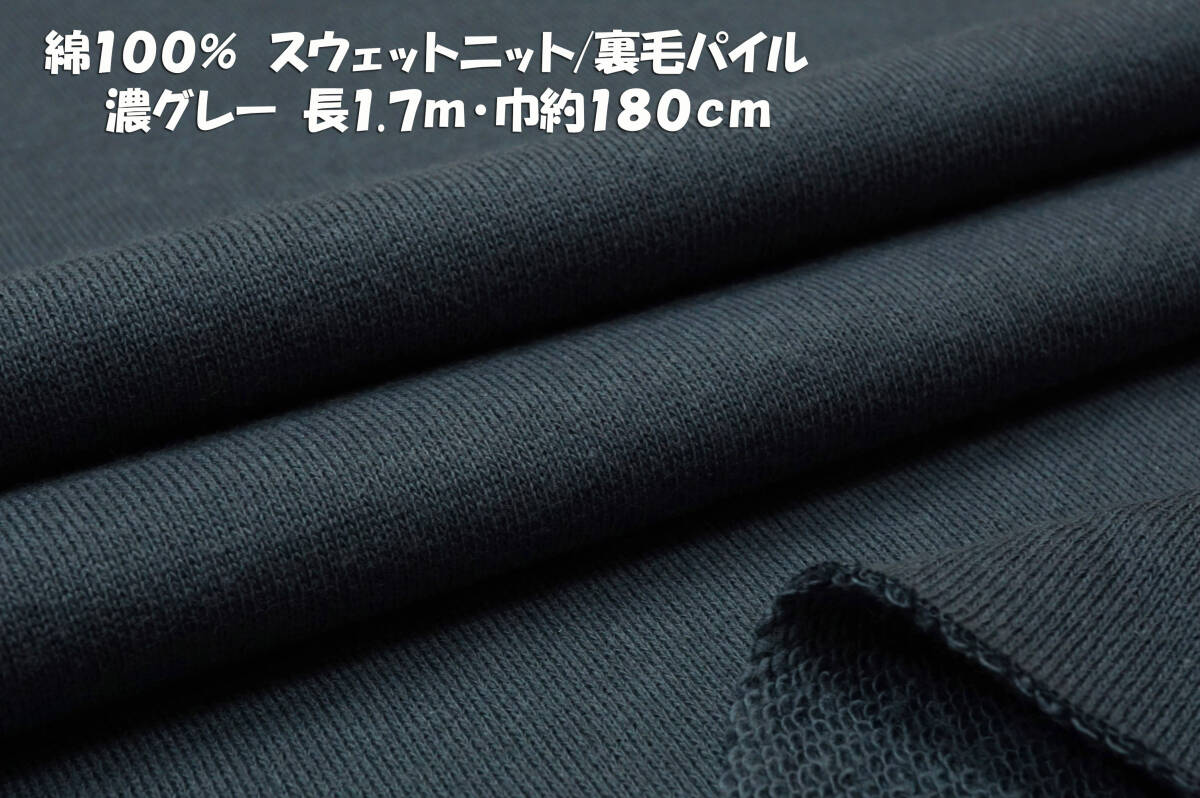 綿100%スウェットニット/裏毛パイル 濃グレー 中厚~やや微厚1WAY伸縮 長1.7m巾約180cm パーカー トレーナー プルオーバー