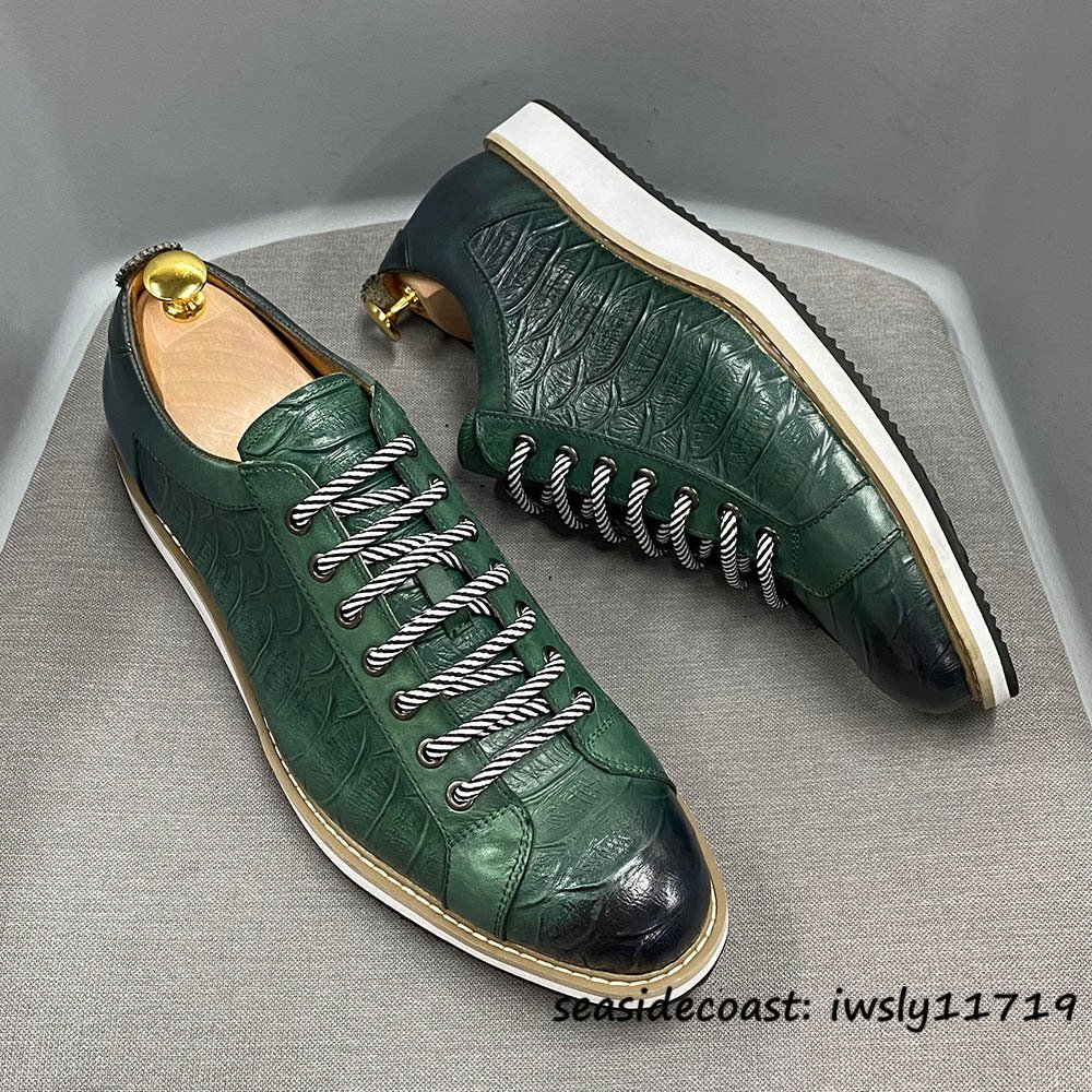 定価9万超◆最高級 スニーカー 本革 レザーシューズ メンズ ビジネスシューズ 牛革 革靴 職人手作り紳士靴 軽量ローファー グリーン 27.5cm