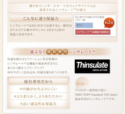 【充填物】 上部素材 ポリエステル100% 下部素材 3MTMシンサレートTM高機能中綿素材ポリエステル100%