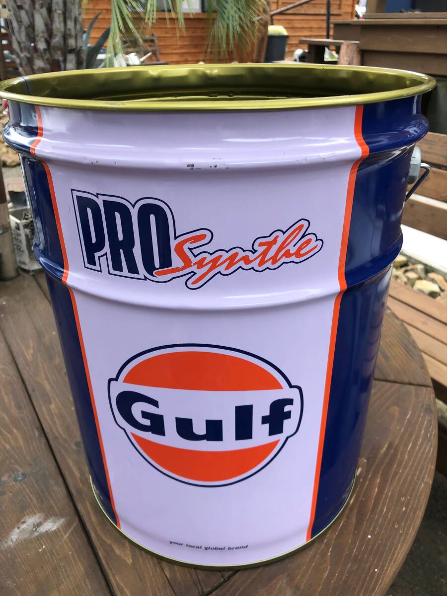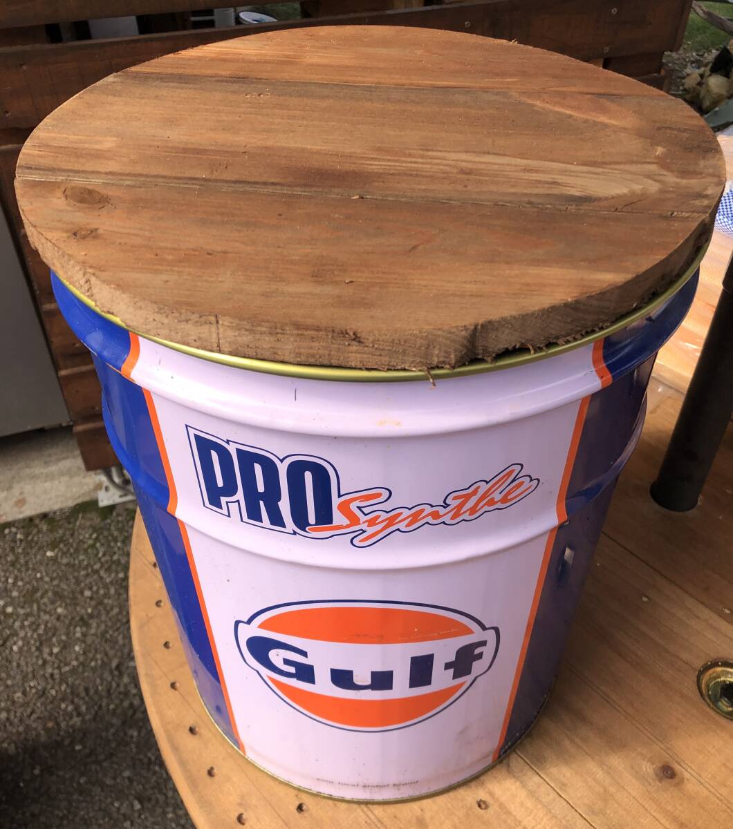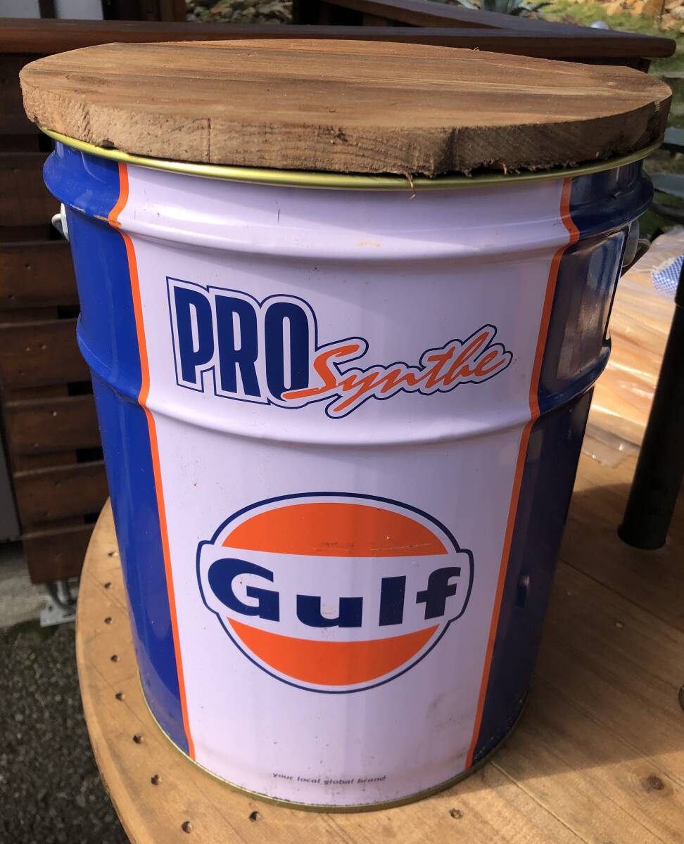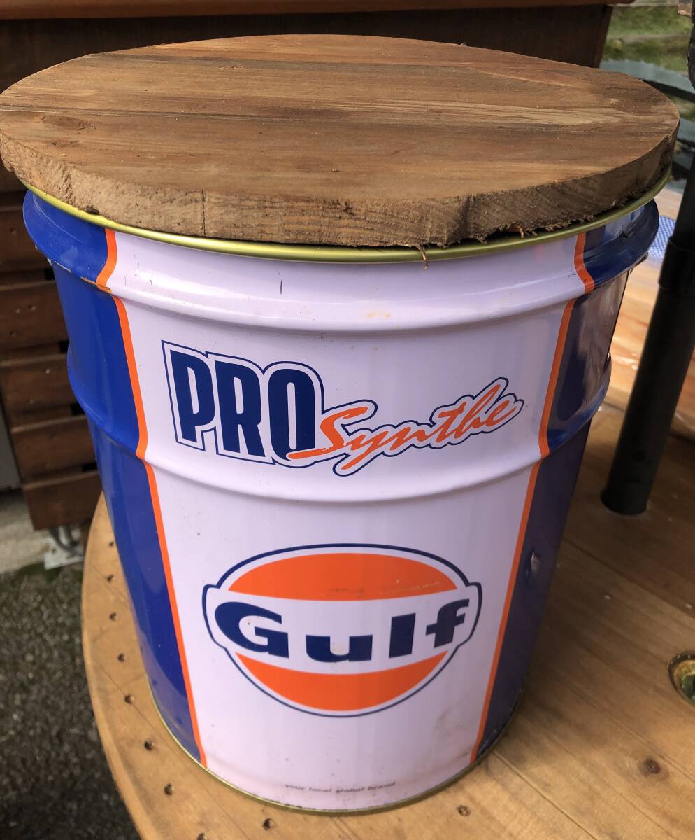 なかなかでないGULFのペール缶椅子です。実際にオイルが入っていた物です。