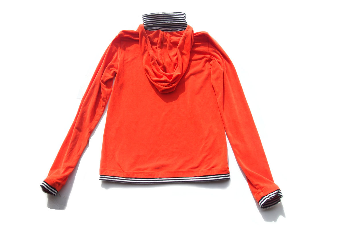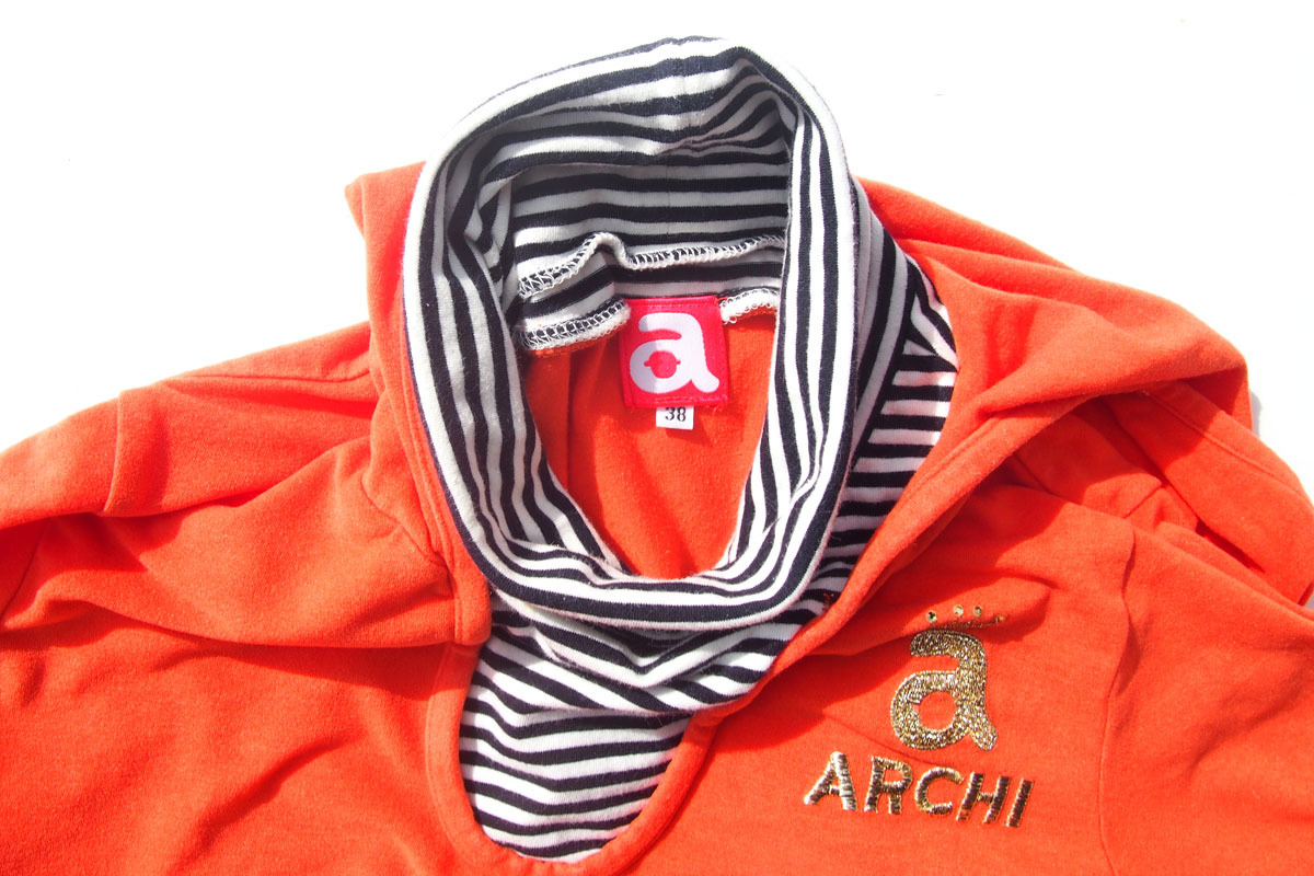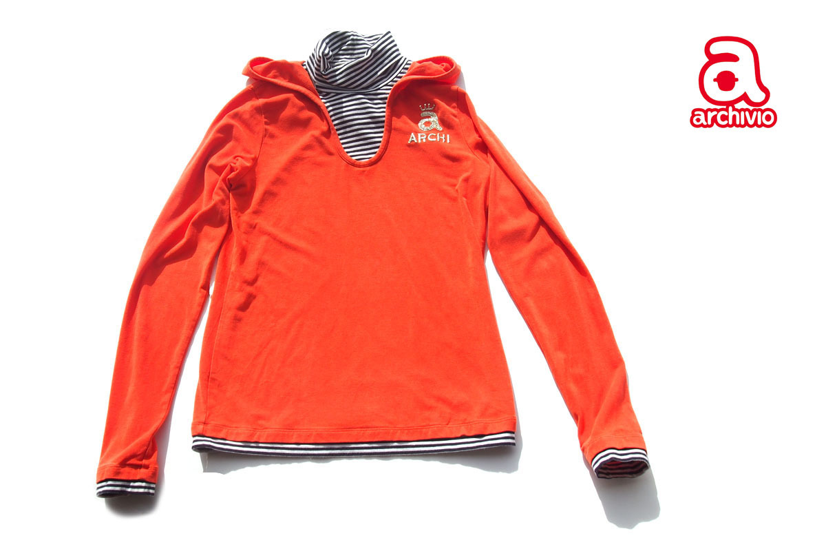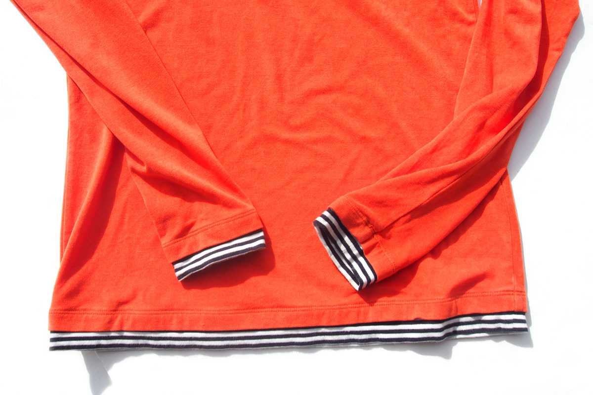 <ARCHIVIO|アルチビオ>のレイヤードタートルロングスリーブシャツは、鮮やかなオレンジカラーにモノトーンのボーダー柄を重ねた、視線を惹きつけるレイヤードデザインが特徴。