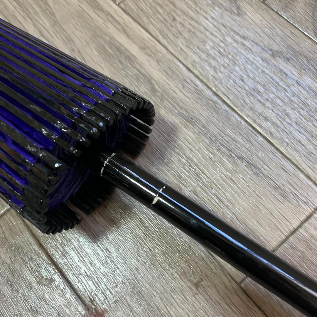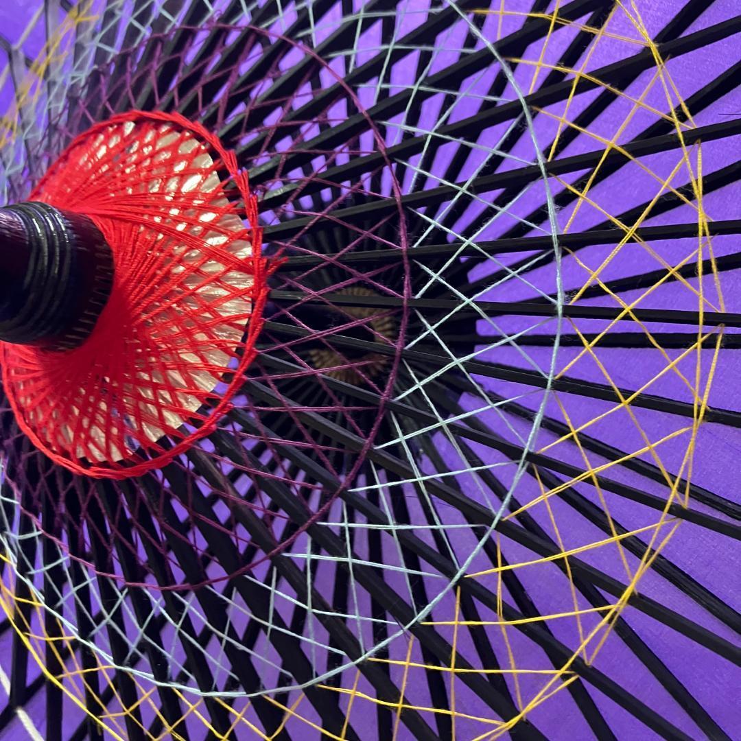 薄い透けた紫色。黒の骨。内側は、カラフルな糸編みで、開いた姿も綺麗です。