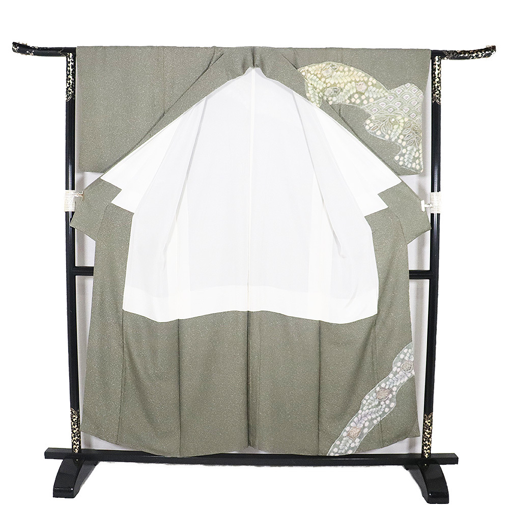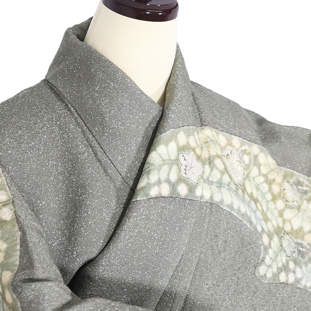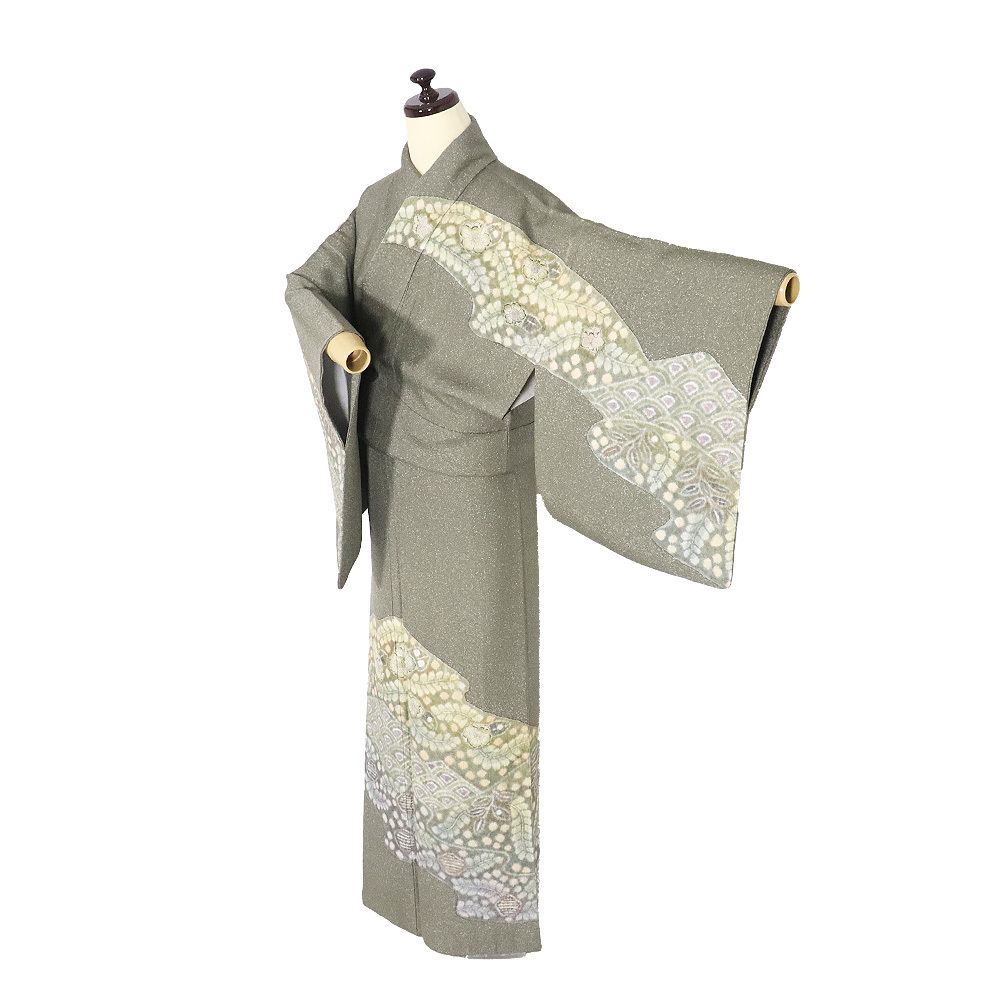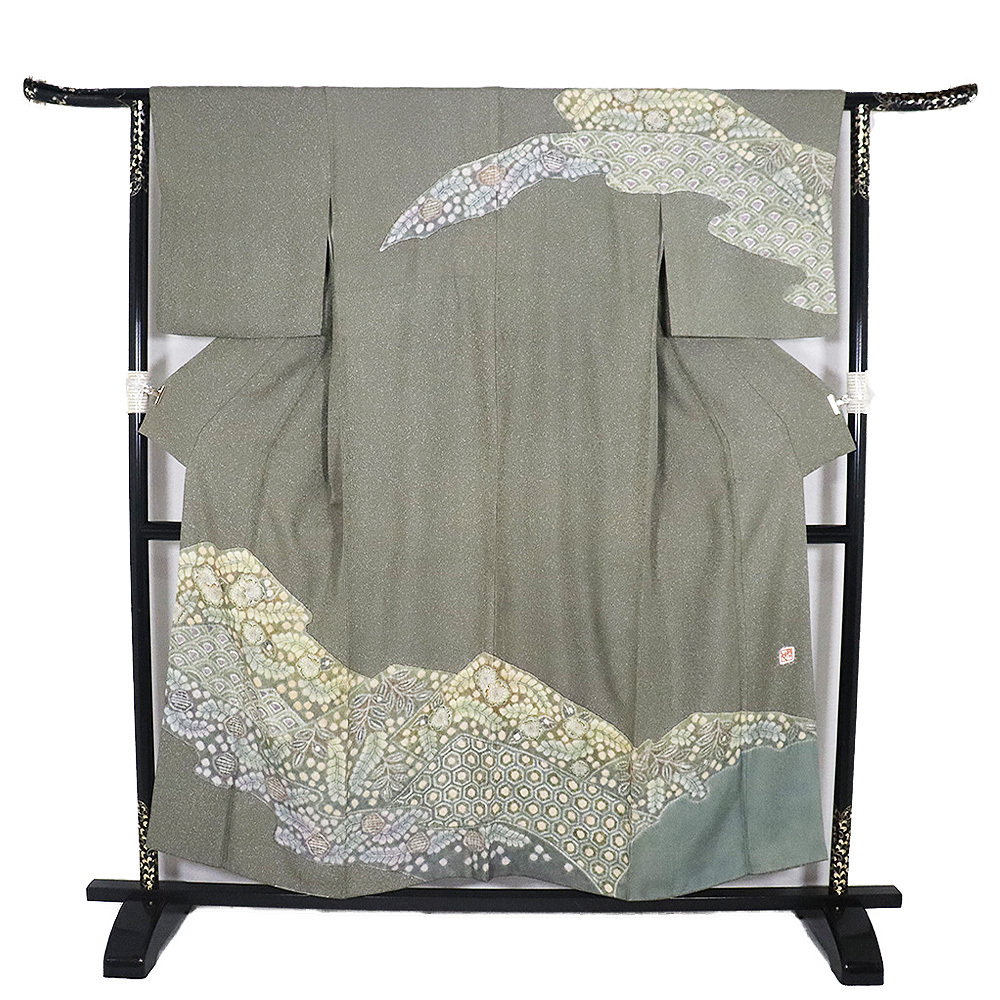 | 商品 | 幻想辻が花作家 樋熊哲也氏作 辻が花訪問着 袷 丹後縮緬地 緑(革色)・しぐれ模様地 絞り・辻が花・亀甲・青海波 160 広襟 作家落款入り |