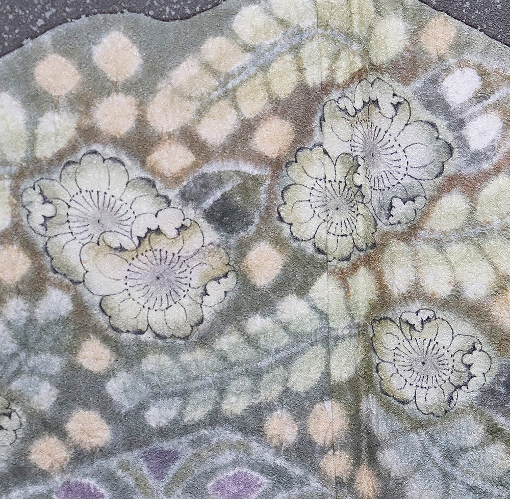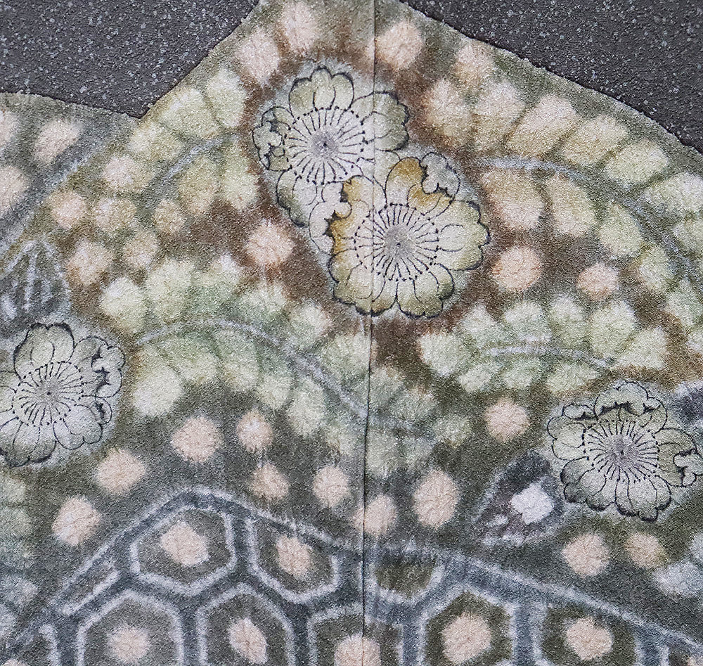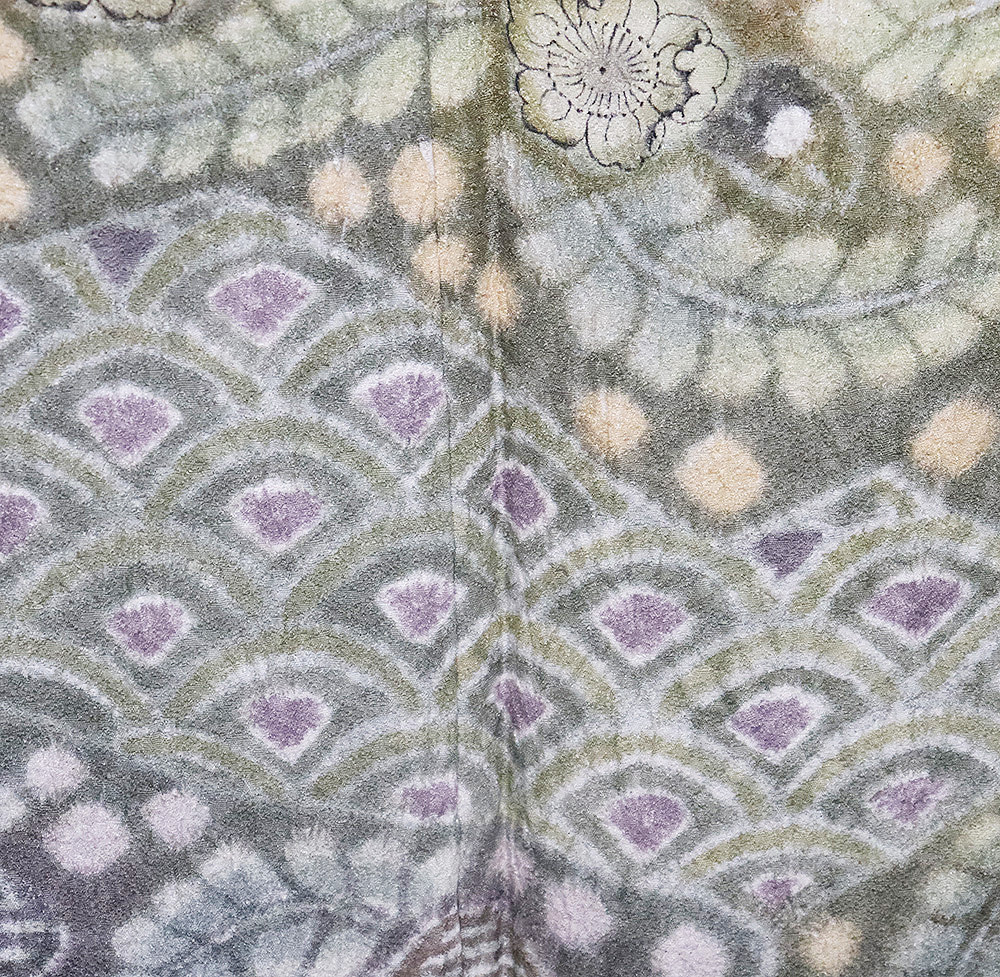 | 色・柄 | 幻想辻が花作家 樋熊哲也氏作 辻が花訪問着 袷 丹後縮緬地 緑(革色)・しぐれ模様地 絞り・辻が花・亀甲・青海波 (写真では上手く色が出ない場合があります。ご了承下さい) |