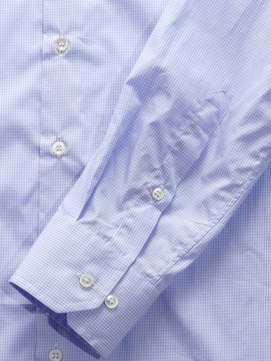 このシャツに限らず他のアルマーニシャツも同様ですが、アルマーニのシャツには他ブランド物とは違うちょっとした工夫があります。既にアルマーニを着用されている方はお分かりのことですが、第一ボタンと第二ボタンの間隔が通常の半分しかありません。厳密には半分も無いくらい間隔が狭い作りになっています。したがってアルマーニのシャツは第一ボタンを外した時にラフ感が出ません。それから第二ボタンまで外した時にヤンチャ感が出ません。暑い季節には第二ボタンまで外すとずっと涼しくなりますが、少しヤンチャというか、悪い表現をするとチンピラみたい見える嫌いがあります。アルマーニシャツは第二ボタンを外してもドレス感を損なうことがありません。すなわち、ノータイのVゾーンバランスが絶妙に抜群に良いのがアルマーニシャツの大きな利点ポイントです。この首元バランスに慣れてしまうと、他ブランドのシャツは少しバランスが悪く不便に感じるようになるから危険です。自分が実際にそうですが、第二ボタンを外したいけどファッション的になんか違うな、と思って外せないときがあります。アルマーニのシャツなら第二ボタンを外しても違和感が出ず、しっくりきます。ボタン位置の違いだけですが、これが意外にも全然違うからファッションは面白いですね。このちょっとしたところに気が付いたジョルジオ・アルマーニ氏は、やっぱりさすがはファッション界のマエストロです。