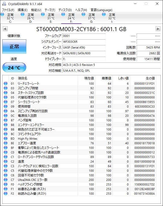 ST6000DM003-2CY186 HDD 6TB 3.5インチ SATA 15411時間 SEAGATE