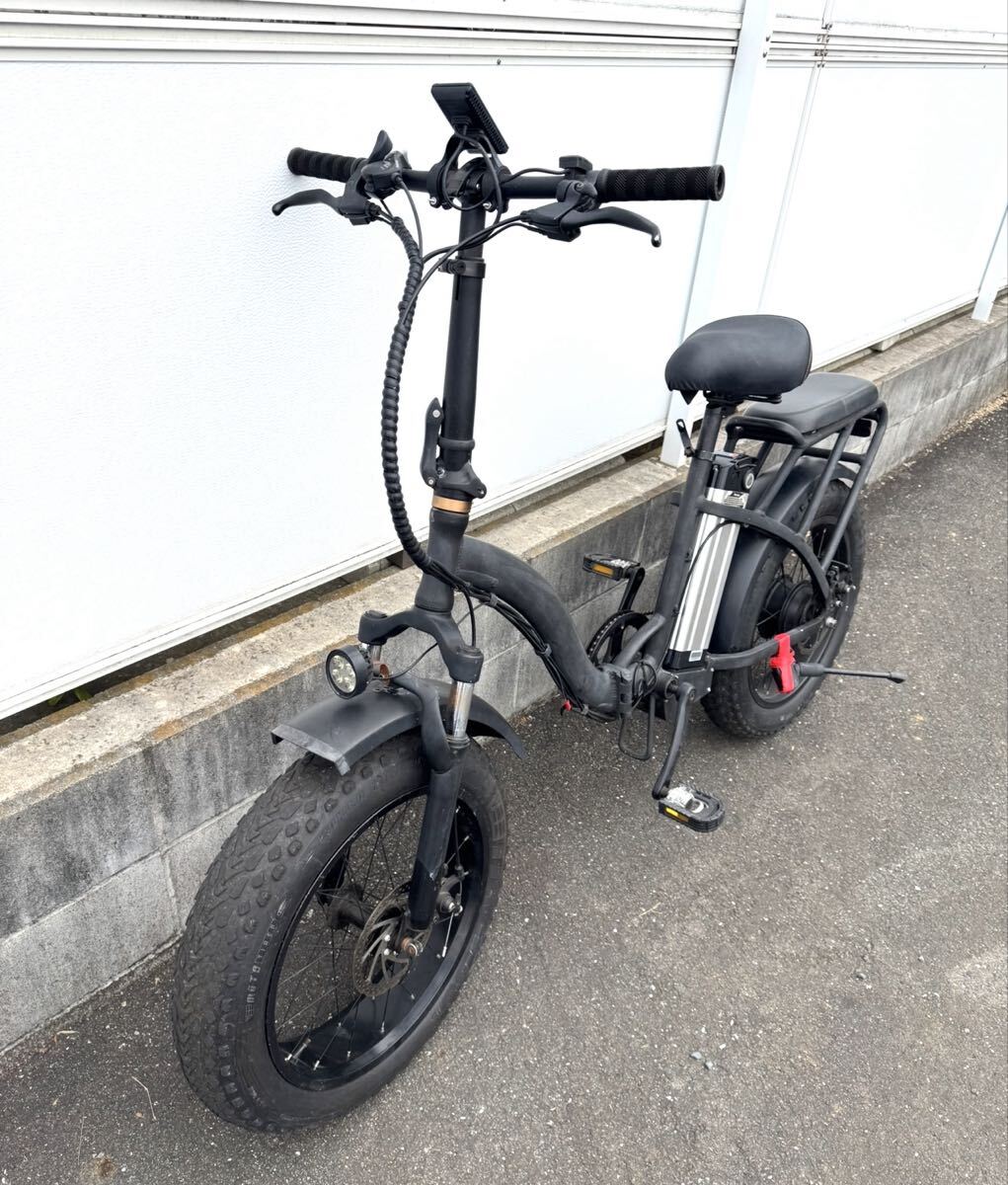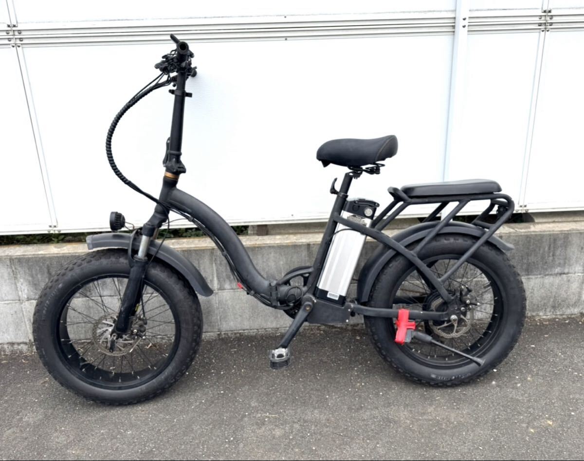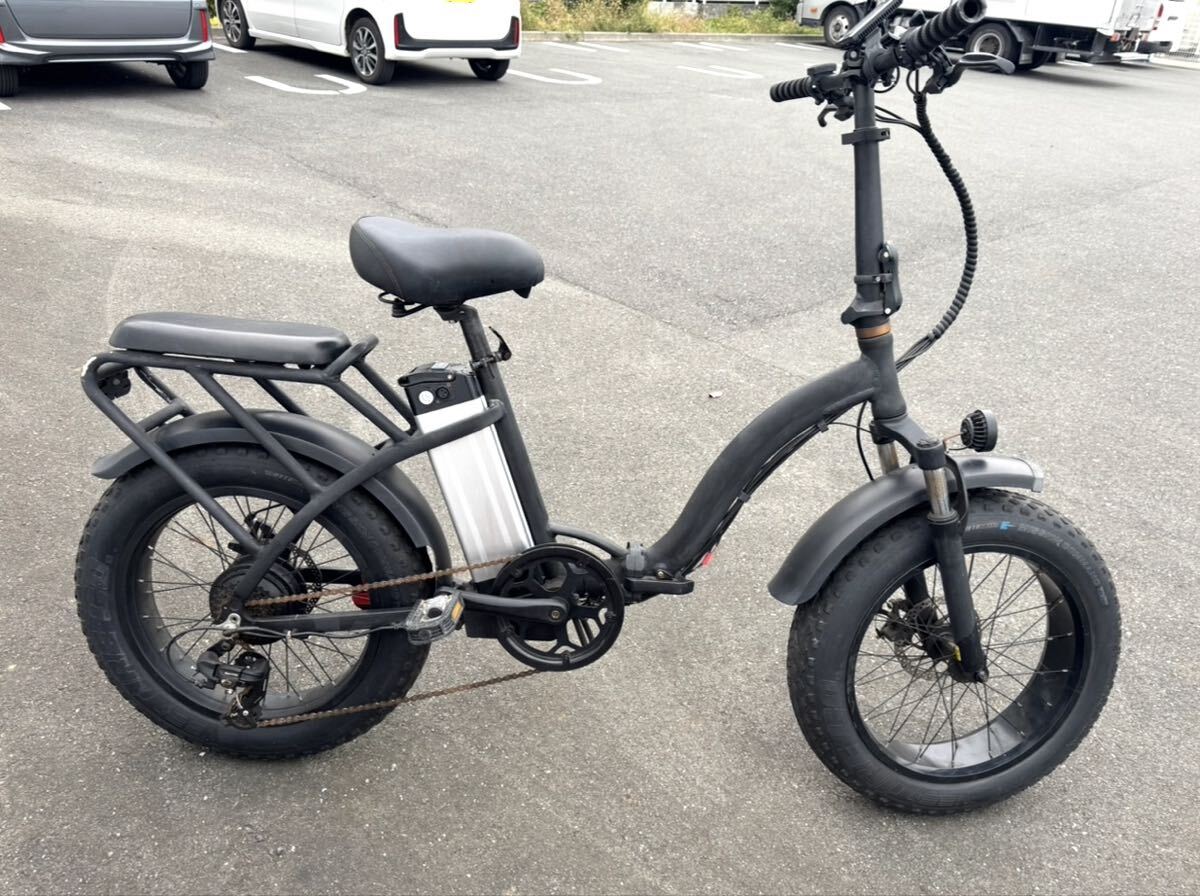 昨年の秋、メルカリで中古車として購入しました。折りたたみ式です。FAT-01の特徴なのかよくわかりませんが、走行時に前輪のタイヤから摩擦音がします。タイヤが非常に太いのでハンドリングは重いです。スタンドのストッピングが緩いので赤いビニールテープを巻き、補完しています。各所に傷やハゲがあり、金属部には錆びがあります。ライトの付け方がわかりません。したがって、点灯しない場合があります。FAT-01の特徴として、アシストをしながら走ると電動バッテリーは長持ちしますが、電動だけで走ると急激に減少します。したがって、電動アシスト自転車として使用してください。