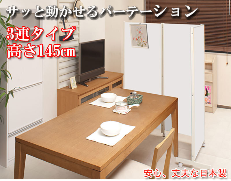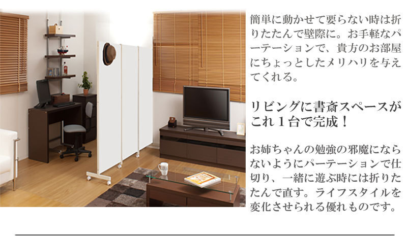 ◇キャスター付でサッと動かせるパーテーション。簡単に動かせて要らない時は折りたたんで壁際に。急な来客時等見せたくない場所をサッと目隠し。お手軽なパーテーションで、貴方のお部屋にちょっとしたメリハリを与えてくれる。リビングを間仕切って書斎スペースがこれ1台で完成!