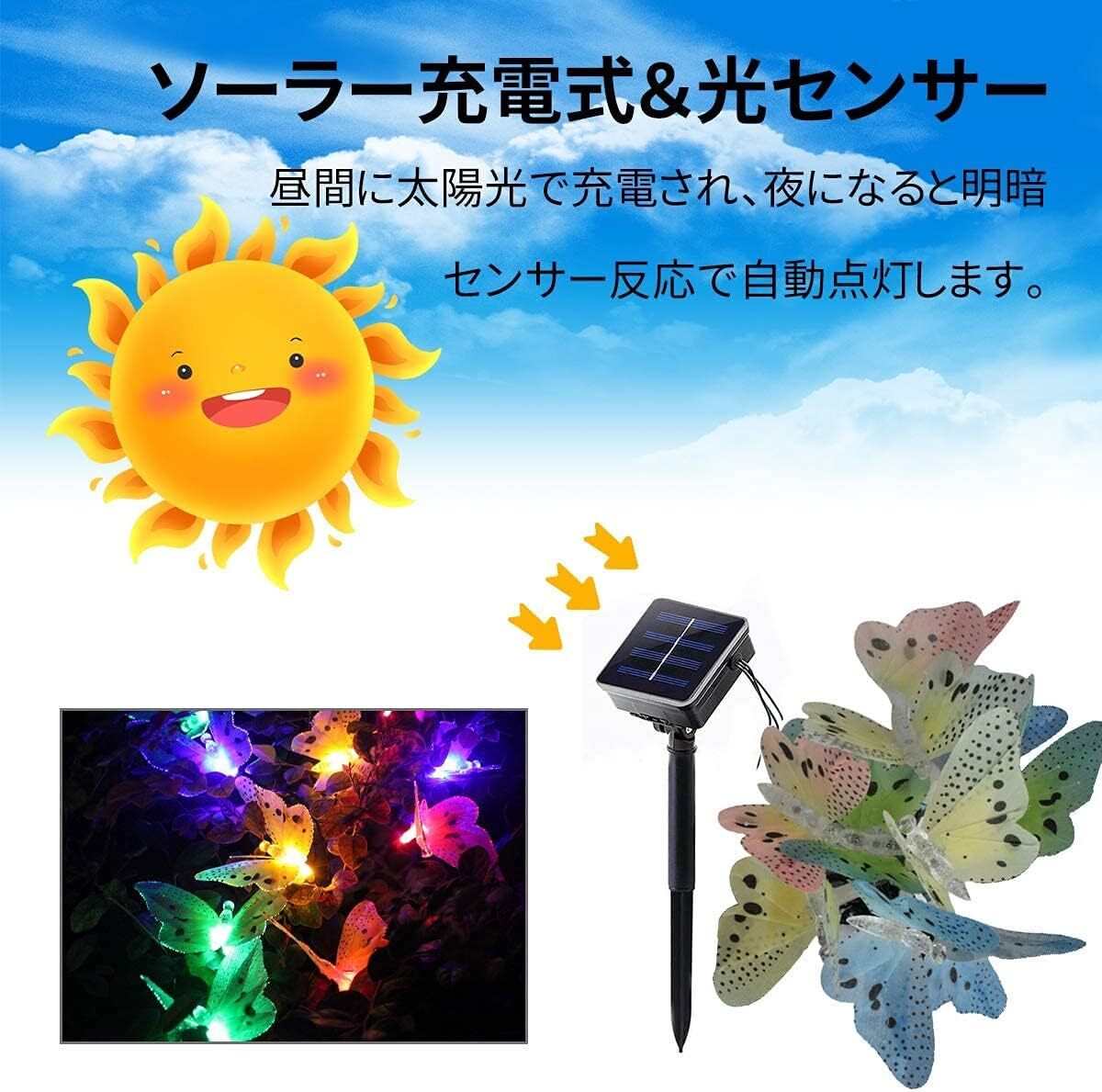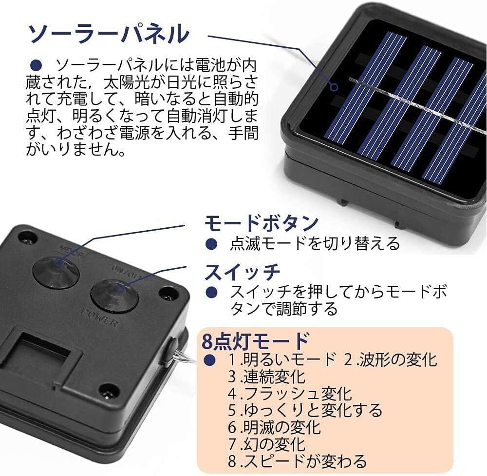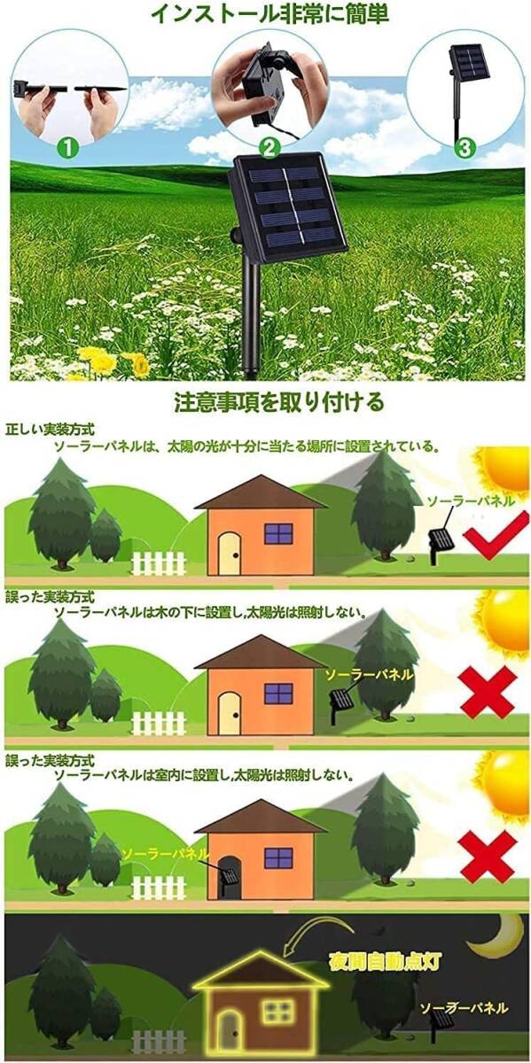 この商品について 【ソーラー充電式】最新の太陽光充電式なので、電気代は0円!日当たりよい場所に置くだけで自動充電、自動点灯。設置後の操作は一切不要です。※注意:充電する前に、スイッチをONの状態で設置してください。OFFの状態で充電できないです。 【点灯モードは8種類】8種類の点灯モードから、お好みの雰囲気やシチュエーションに合わせてお選びいただけます。 【配線工事不要】地面に差し込むだけで設置完了。自動点灯・消灯なので点け忘れや消し忘れもなく、毎日イルミネーションを楽しめます。イルミネーション初心者におすすめ。※ご注意:点灯テストの時、ソーラーパネルを暗い環境に置いてくだい。周りが明るいなら、手または毛布でソーラーパネルを覆いて、点灯できるかどうかをご確認ください。 【屋内/屋外兼用】発熱量が圧倒的に少ないので、巻きつける植物を痛めません。植物を傷めない、環境にやさしい。 ★防水等級がIP65です。屋外での使用可能!庭、植木、その他の場所など色々な場所に飾りつけることができます。 【高輝度LED】広拡散、高輝度LEDを採用して一粒一粒が明るくてどの方向から見ても綺麗です。ソーラーイルミネーションライト:LED12球/セット、長4M(延長線2M)、点灯モード8種類、IP65防水、ソーラー充電式、日本語説明書付き |