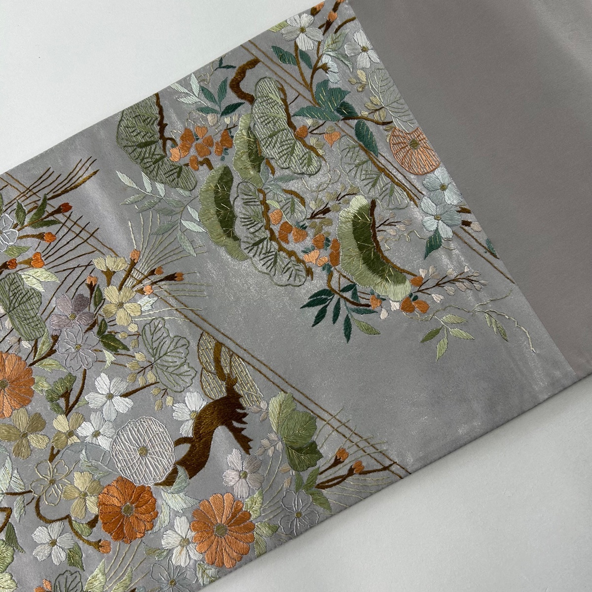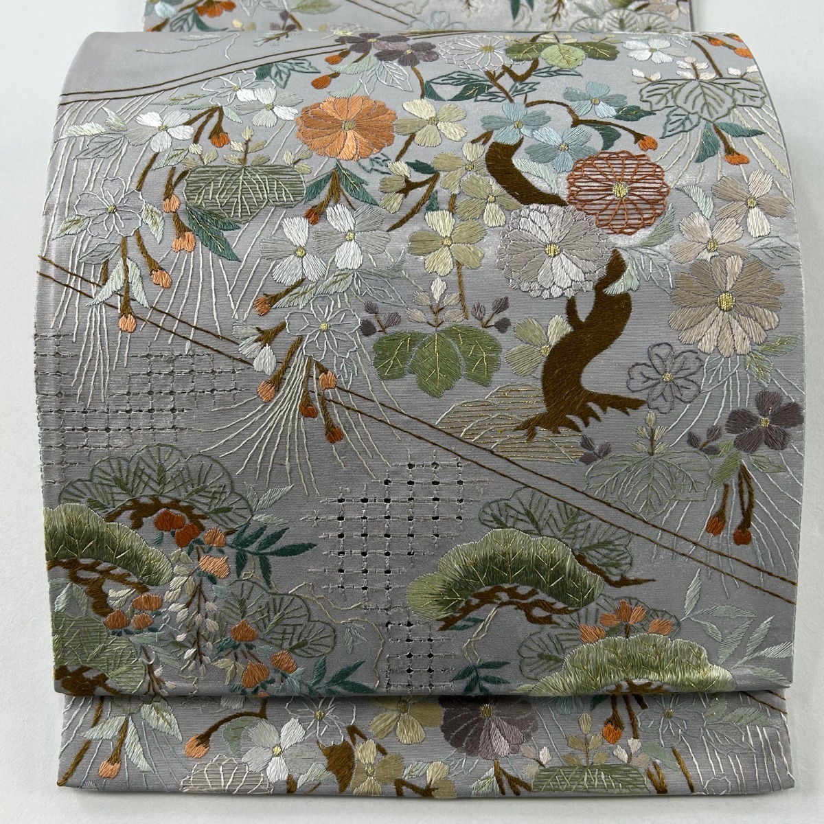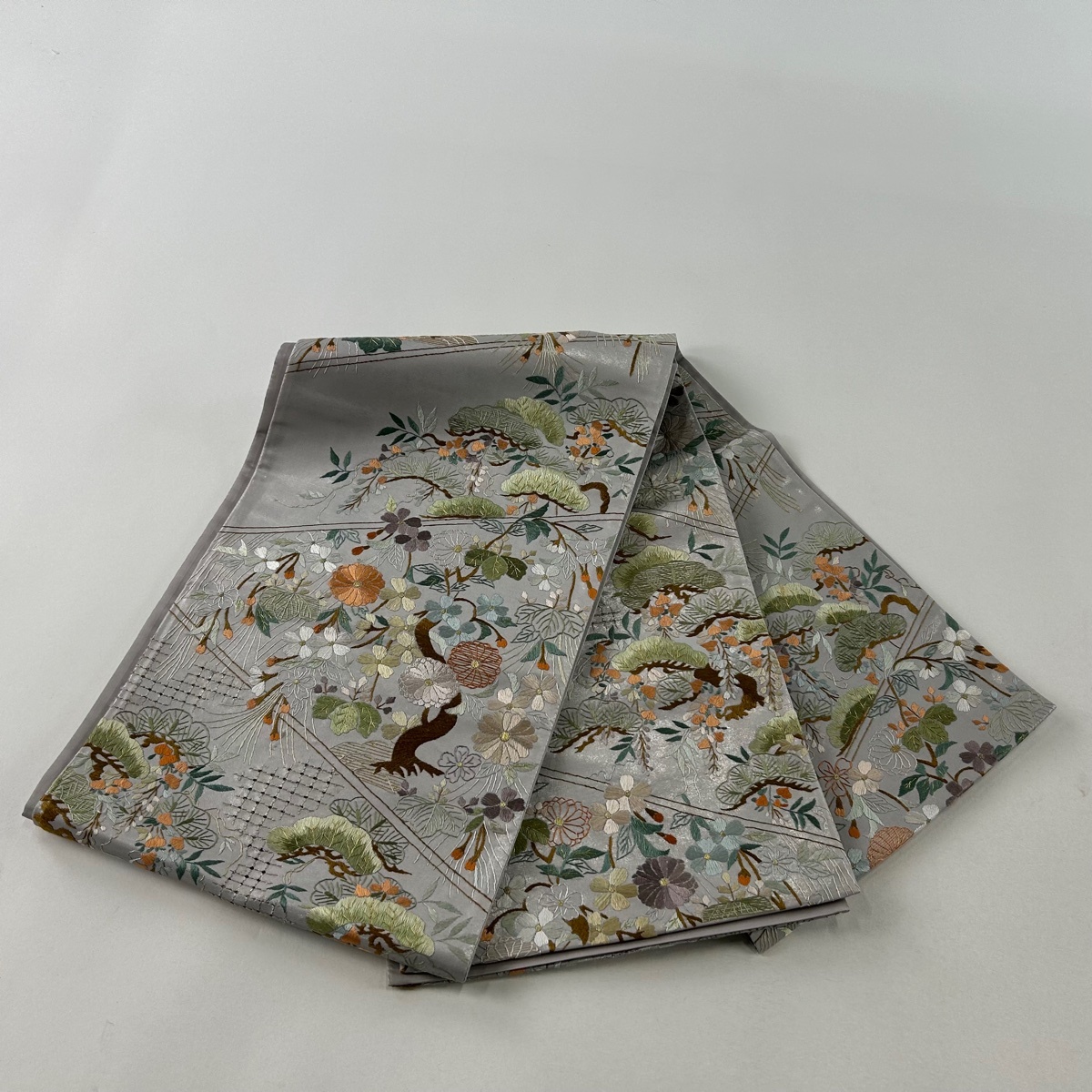 | 袋帯 美品 逸品 松 草花 刺繍 金糸 灰色 六通 正絹 【中古】 |