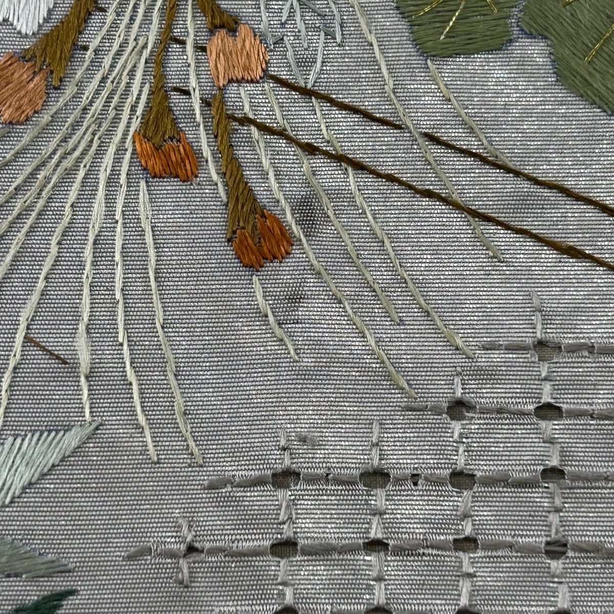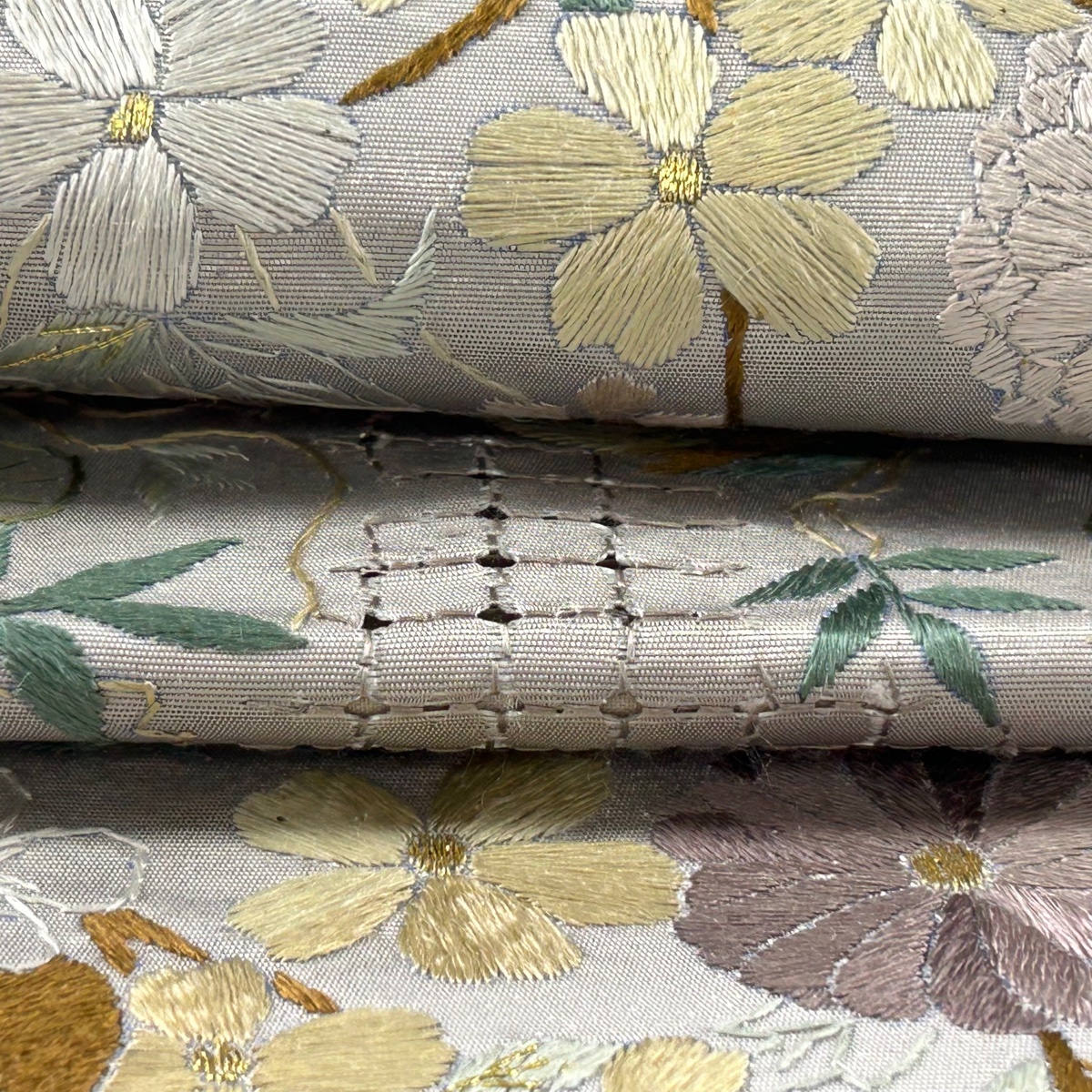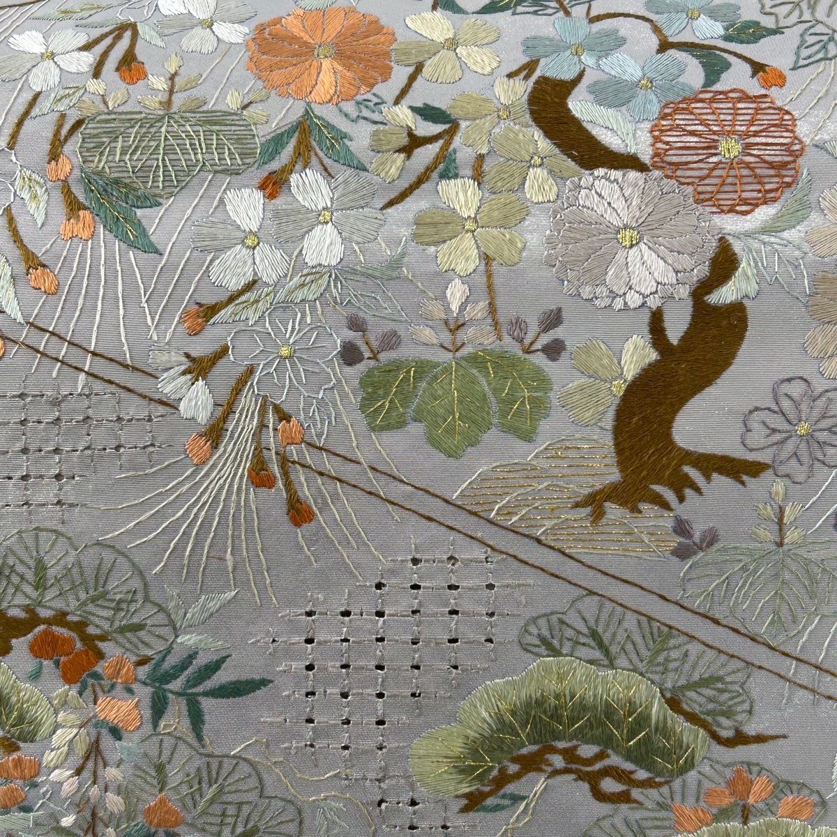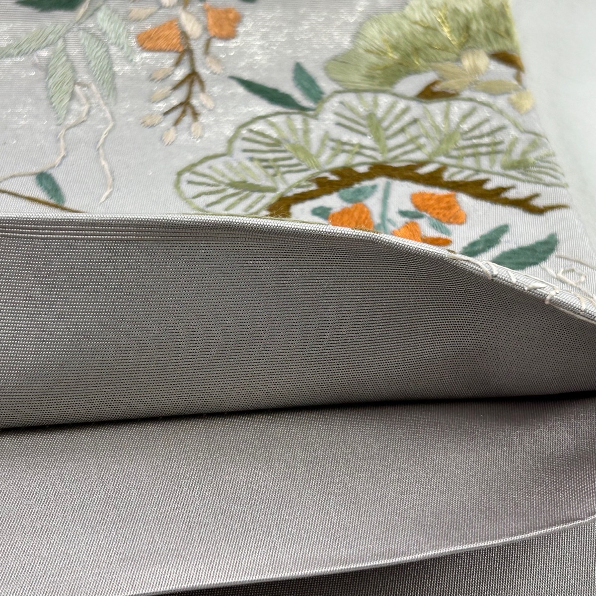 | 袋帯 美品 逸品 松 草花 刺繍 金糸 灰色 六通 正絹 【中古】 |