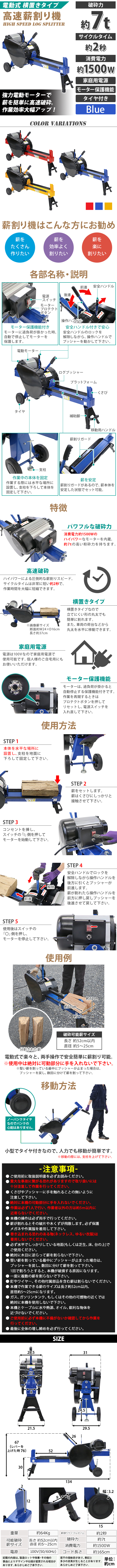 | 商品名 | 送料無料 高速薪割り機 電動薪割り機 薪割り機 ログスプリッター 電動 高速破砕 破砕力約7t 最大対応薪サイズ直径約25cm長さ約52cm 消費電力約1500W 電源100V モーター 強力 小型 ブルー 薪割機 横割り カッター 家庭用 業務用 薪 破砕 木 木材 丸太 青 logss047tbl |