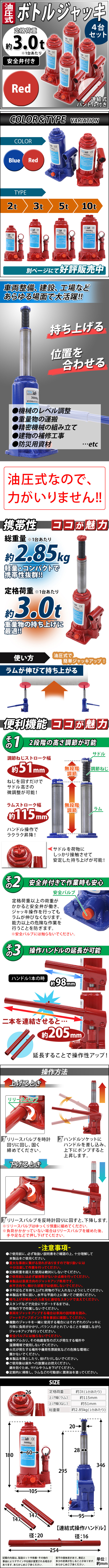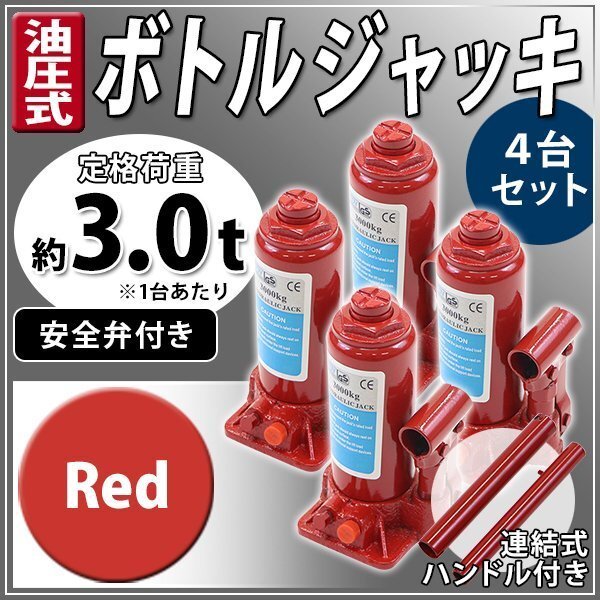 | 商品名 | 送料無料 油圧式 ボトルジャッキ 定格荷重約3t 約3.0t 約3000kg 4台セット 4個 油圧ジャッキ だるまジャッキ ダルマジャッキ ジャッキ 手動 安全弁付き ジャッキアップ タイヤ交換 工具 小型 軽量 車載用 車 整備 修理 メンテナンス 工場 作業 レッド bjackt4043t4p |