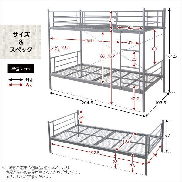 ①耐震性抜群のスチールパイプ製2段ベッドです。