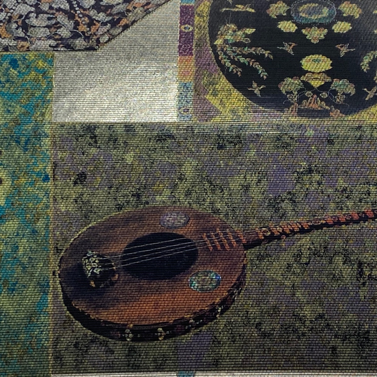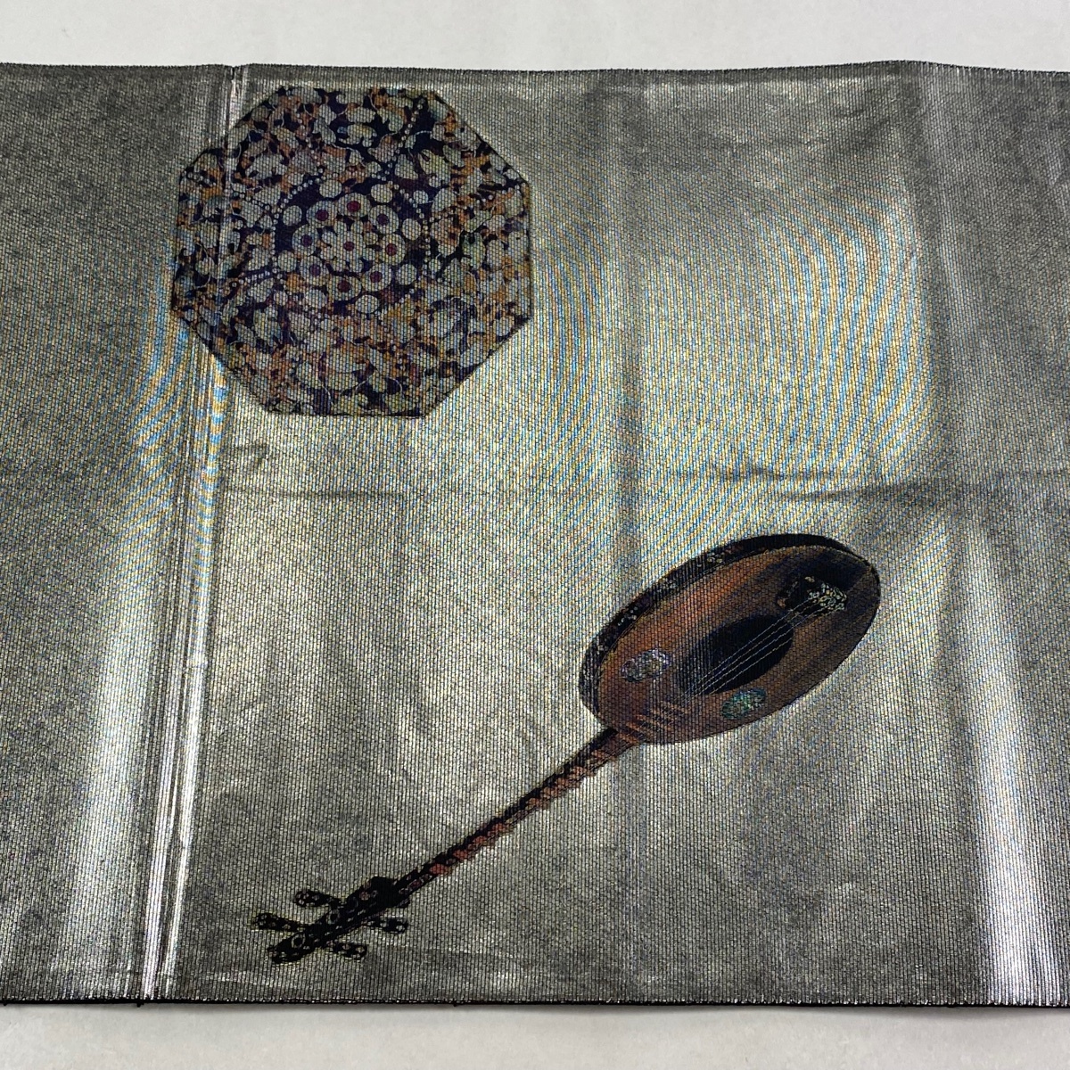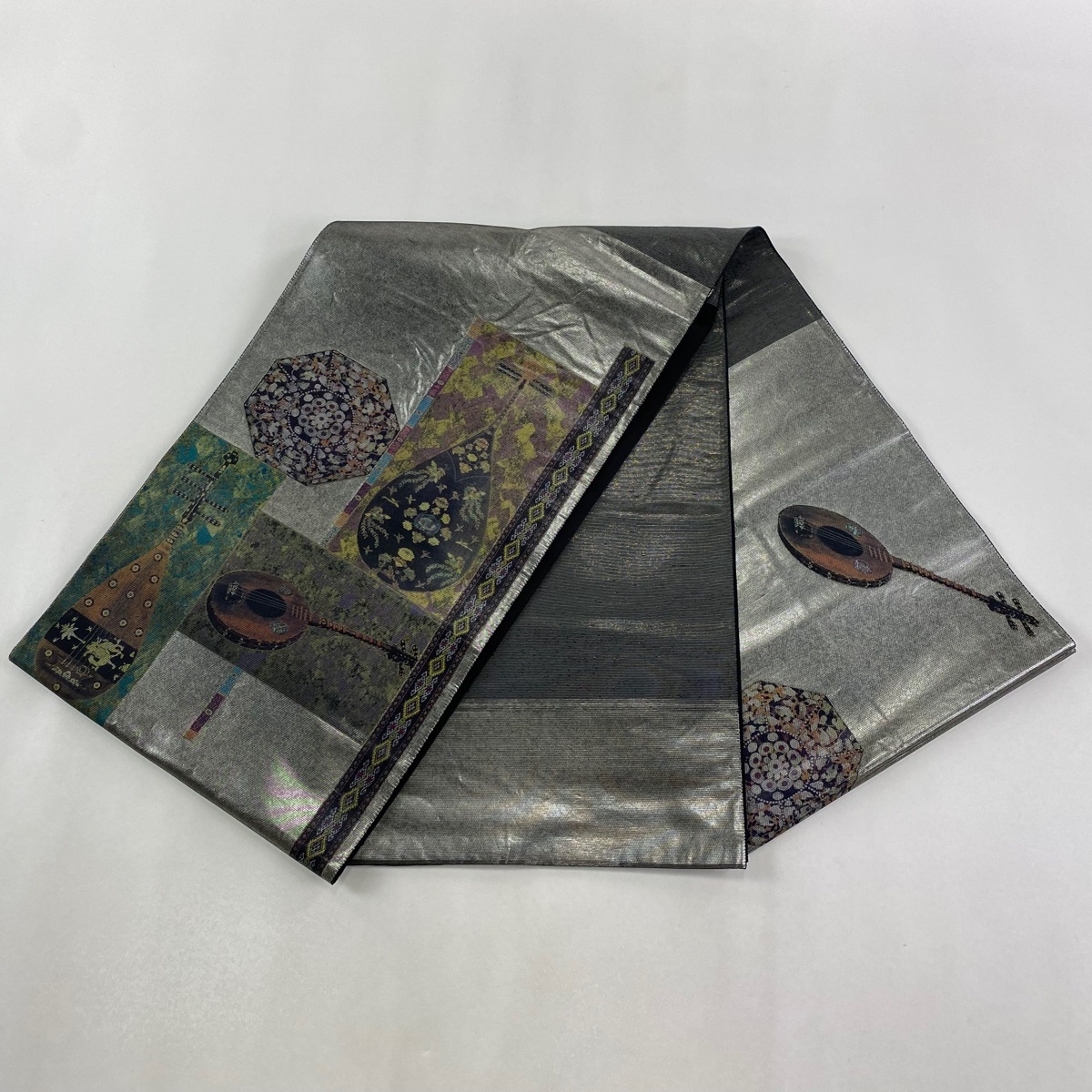 | 袋帯 秀品 和楽器 花鳥 螺鈿 箔 黒灰 お太鼓柄 正絹 【中古】 |