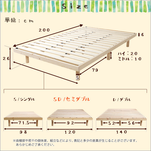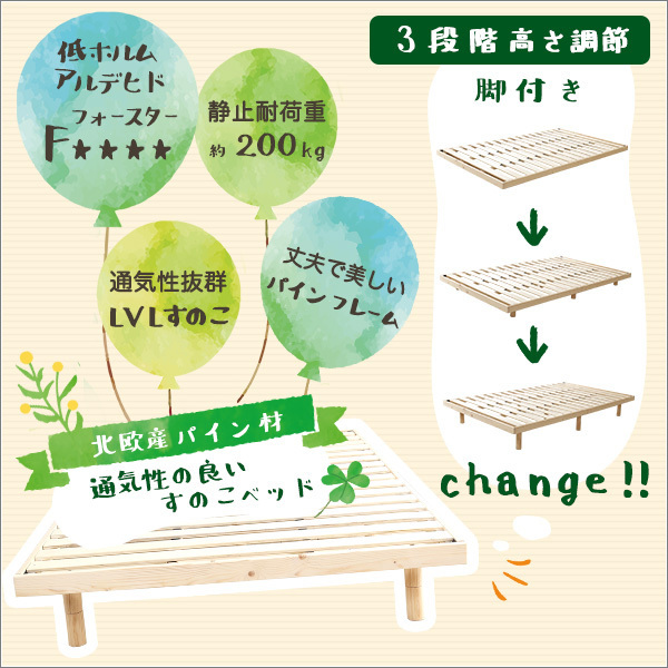 【ポイント】 お好みに合わせて3段階に高さを調節できる脚付きです。 北欧産パインフレームを使用した、通気性と耐久性に優れた頑丈設計です。 やさしい無垢材のナチュラル、爽やかなホワイトアッシュ、シックなブラウンの3色がございます。 低ホルムアルデヒド仕様で、F★★★★(フォースター)獲得!お子様にも安心です。 |