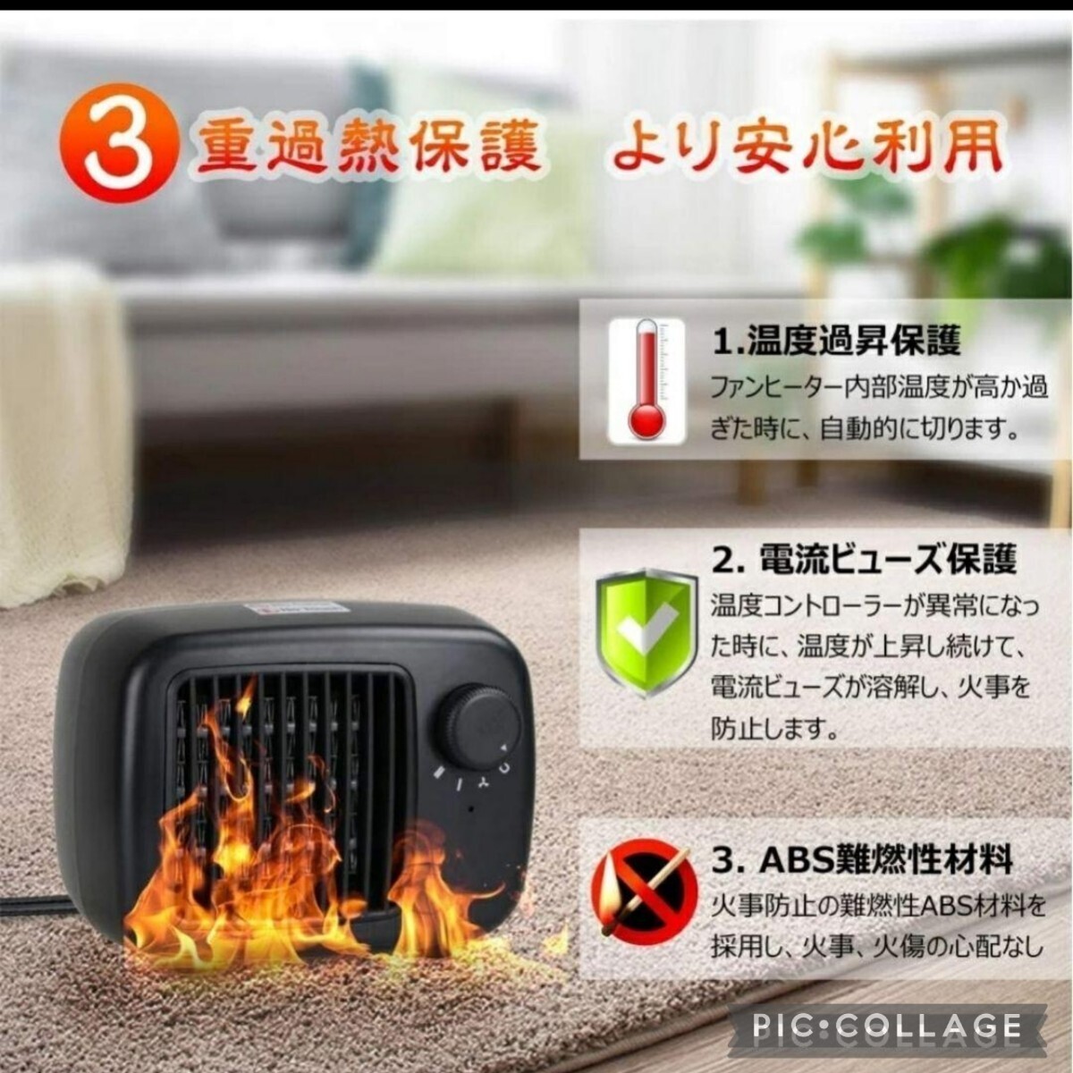 【6重安全構造&安心使用】安心安全のPSE認証済み・内蔵転倒自動OFF機能・過熱保護・ABS防災材料・PTCセラミック発熱シートを採用、直火なし、6重安全構造付きの足元ヒーターで、より安全安心で使用できます。内蔵転倒自動OFF機能:利用の際に、転倒時電源遮断装置付き、ヒーターの転倒時に自動的に電源がOFFになります。過熱保護機能:不適切な使用環境や使用方法によりファンヒーター内部温度が高か過ぎる場合、内蔵の温度過熱防止装置(サーモスタット)が作動し、自動的に電源を切り、加熱を中止します。