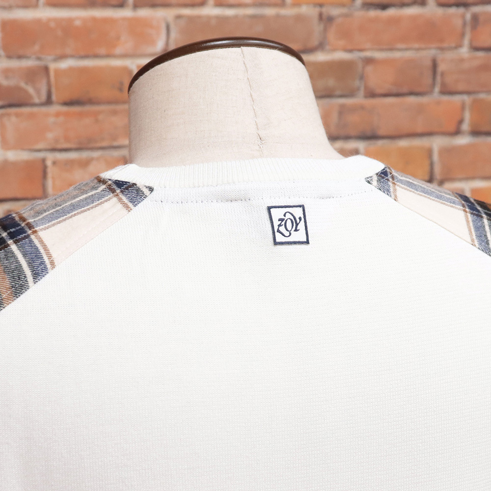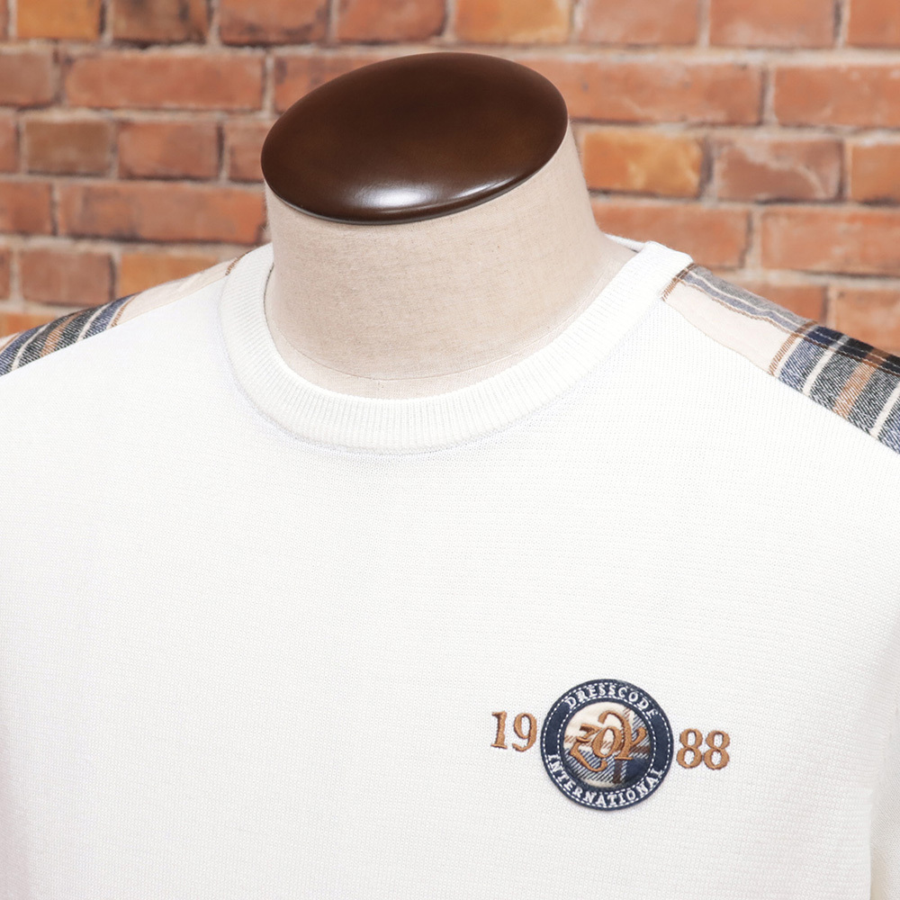 チェック生地の切り替えデザインが印象的なクルーネックニット。表面には撥水加工糸「Proof PLUS(プルーフプラス)」、裏面には東レのセラミック練り込み素材「ダイナホット」を使用した「ホットレイ」をプレーティング。薄手ながらも高い機能を備えた仕上がりです。