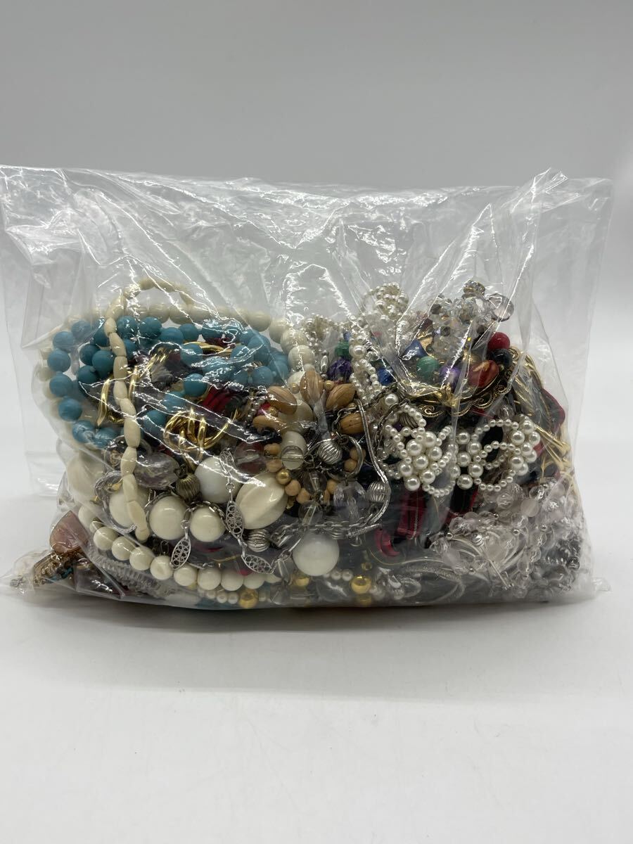 The bag includes various items such as necklaces, bracelets, bead accessories, pearl-like items, and more.