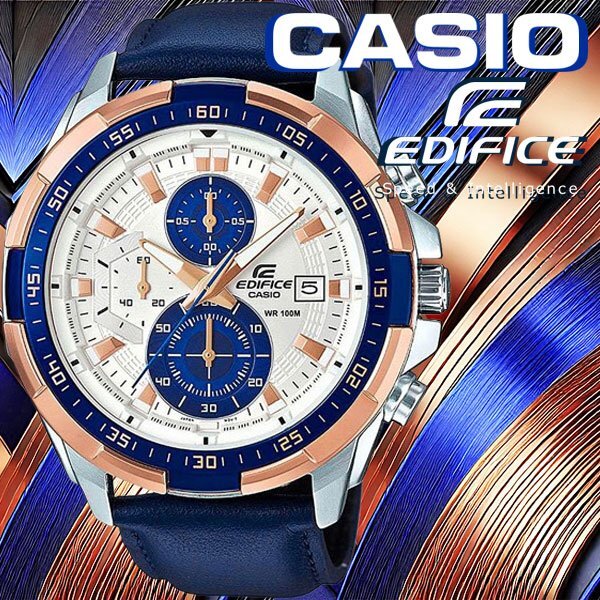 カシオEDIFICEエディフィス欧米モデル ゴールド&ブルー 100m防水 クロノグラフ 本革 CASIO 新品未使用 メンズ 本物