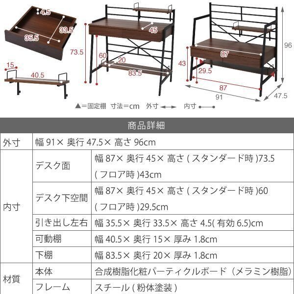 【カラー】 ブラウン 【サイズ】 <外寸> 幅91×奥行47.5×高さ96cm <内寸> デスク面:幅87×奥行45×高さ(スタンダード時)73.5(フロア時)43cm デスク下空間:幅87×奥行45×高さ(スタンダード時)60(フロア時)29.5cm 引き出し左右:幅35.5×奥行33.5×高さ4.5(有効6.5)cm 可動棚:幅40.5×奥行15×厚み1.8cm 下棚:幅83.5×奥行20×厚み1.8cm 【材質】 本体:合成樹脂化粧パーティクルボード(メラミン樹脂) フレーム:スチール(粉体塗装) 【耐荷重】 天板:(約)30kg以下 引き出し:(約)10kg以下/杯 可動棚:(約)3kg以下 下棚:(約)5kg以下 【生産国】 中国 【梱包】 サイズ:96×51×14cm、重量:23.5kg 【その他】 ・可動棚:1枚 ・背面化粧有り ・ハイ、ロー高さ変更可能 ・六角レンチ同梱 【組み立て品】 お客様による組み立てが必要です。 |