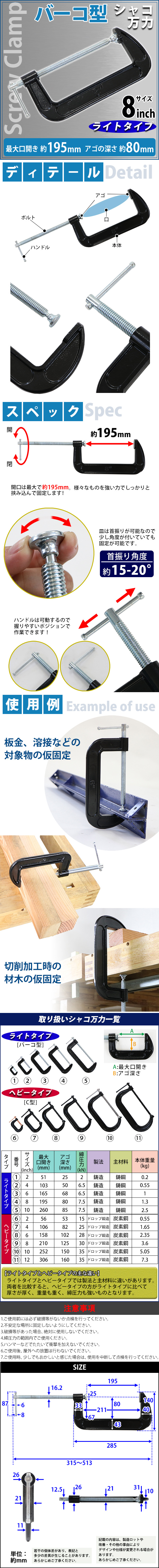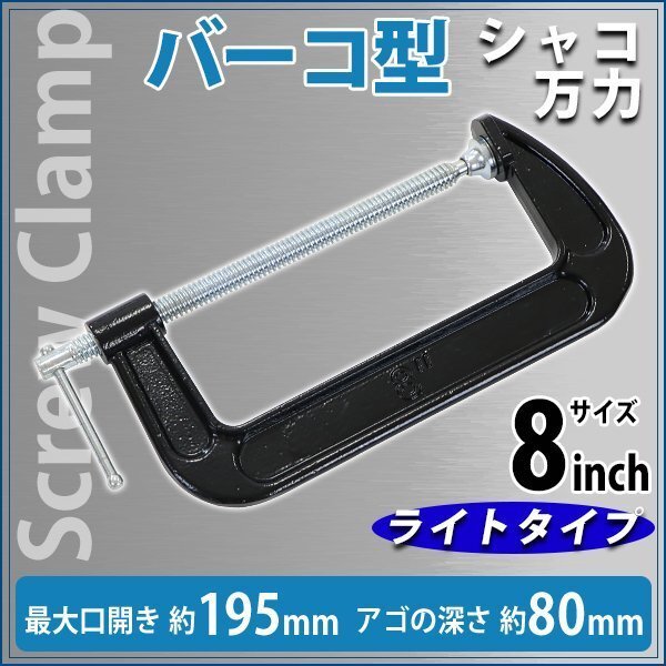 | 商品名 | 送料無料 シャコ万力 バーコ型 最大口開き約195mm アゴ深さ約80mm 8インチ ライトタイプ クランプ 首振り式 皿 B型 板クランプ スチール製 鋳鋼 作業 工具 締め付け 固定工具 締め具 ワイド 穴あけ 溶接 木工 bshakol8inch |