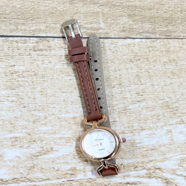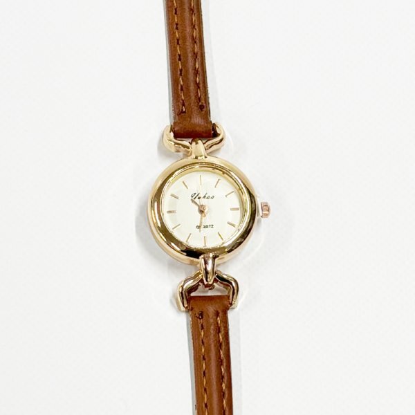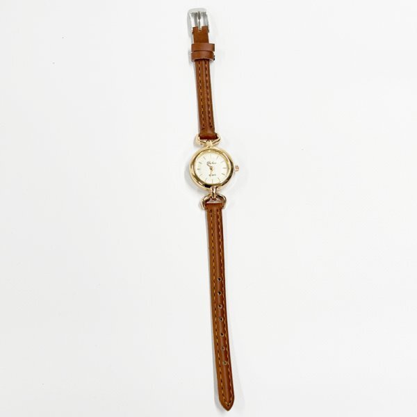 やわらかなレザーとゴールドのベゼルが、手元に上品な華やかさを添える一本。