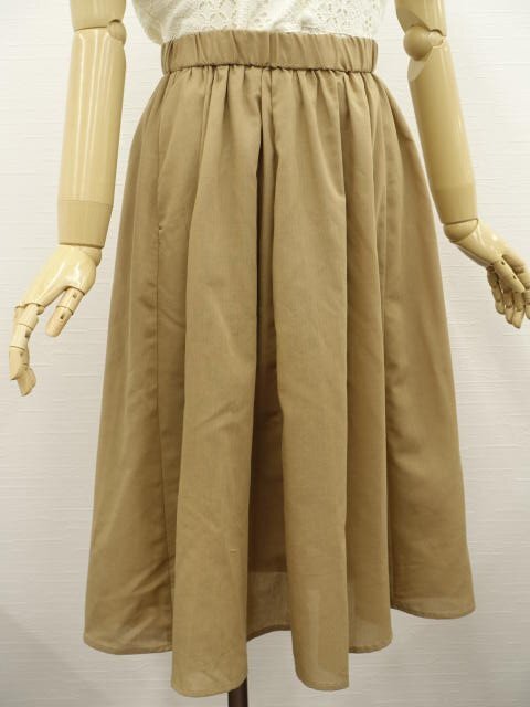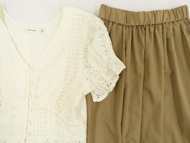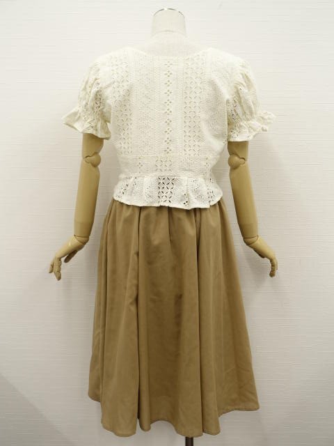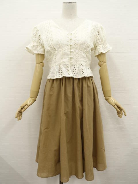 洗える半袖レースブラウス+ロング丈ギャザースカート コーディネート上下2点セット M相当 オフホワイト/ライトブラウン カジュアル系 20代