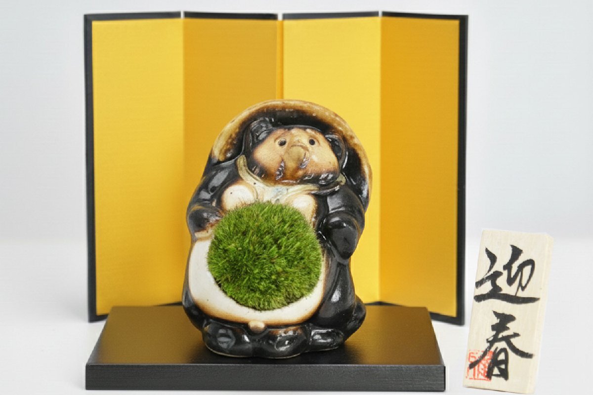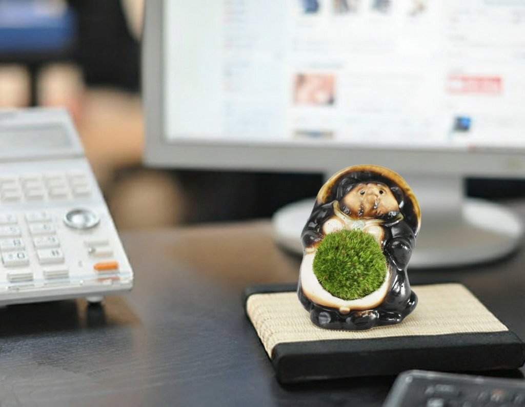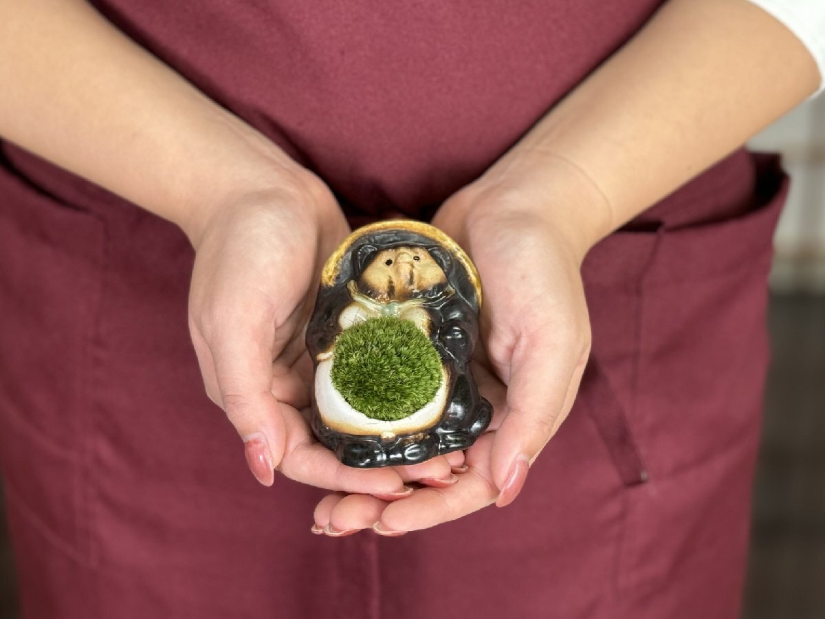盆栽は自然の風景を器に模したものになります。緑や花や紅葉といった四季を身近に感じられる良さが観葉植物と違って盆栽にはあります。都会で生活する中で四季を感じづらくなった私たちにぴったり、また盆栽の日々の成長を感じることで毎日が楽しくなり張りがでます。生活に緑をとりいれるなら盆栽をおすすめする理由です。また器にもこだわりました。より身近に盆栽をおいてもらえるように、馴染みの深いたぬきの置物を器に選びました。日本六古窯である陶器の里「信楽焼」で作られたブランド陶器、たぬきの産地といえば滋賀県信楽町です。信楽町には大勢のたぬき職人がおり、作る職人によって顔や形がそれぞれ違います。その中でもとくに愛らしい顔をつくるたぬき職人にお願いして苔盆栽の器をつくってもらうことが出来ました。愛らしいたぬき姿と苔の魅力、盆栽を楽しむきっかけになるとうれしいです。