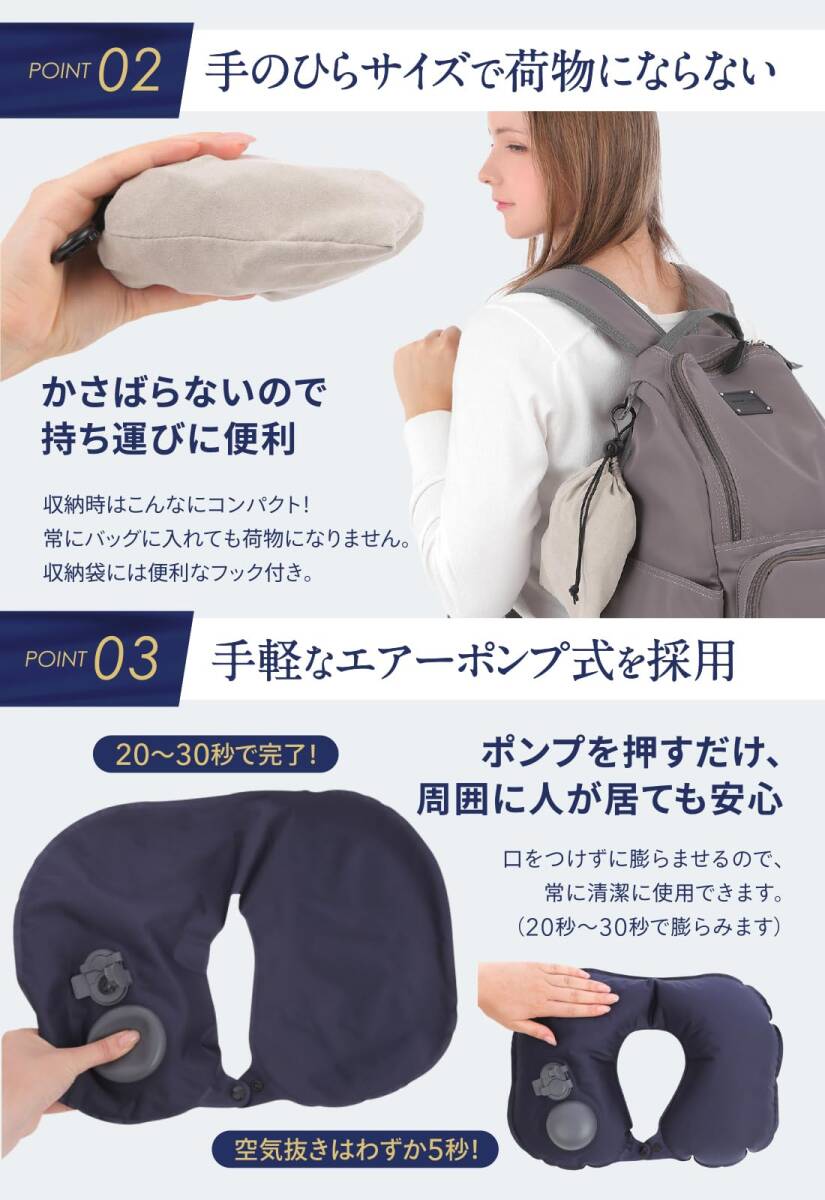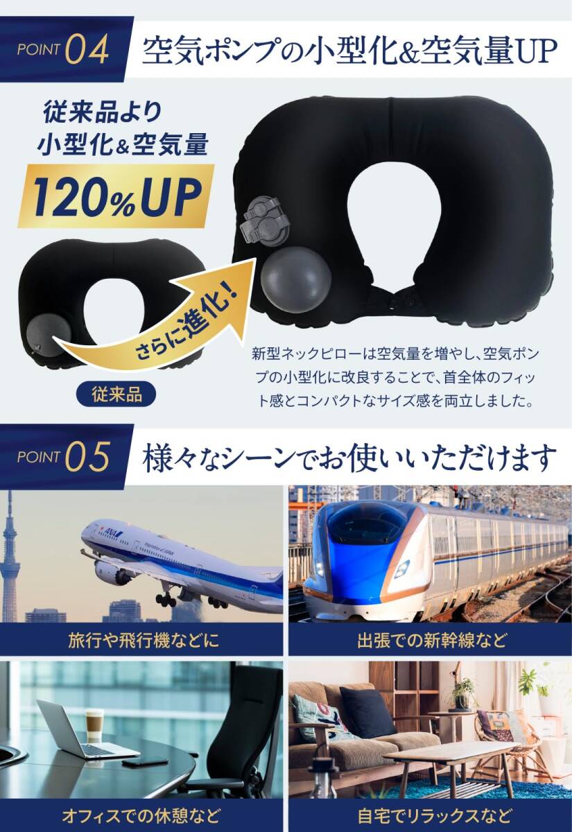 【空気ポンプの小型化&空気量UP】従来品よりポンプの形状を小型化改良、それに伴い空気量120%UP。新型ネックピローは空気量を増やし、空気ポンプの小型化に改良することで、首全体のフィット感とコンパクトなサイズ感を両立しました。