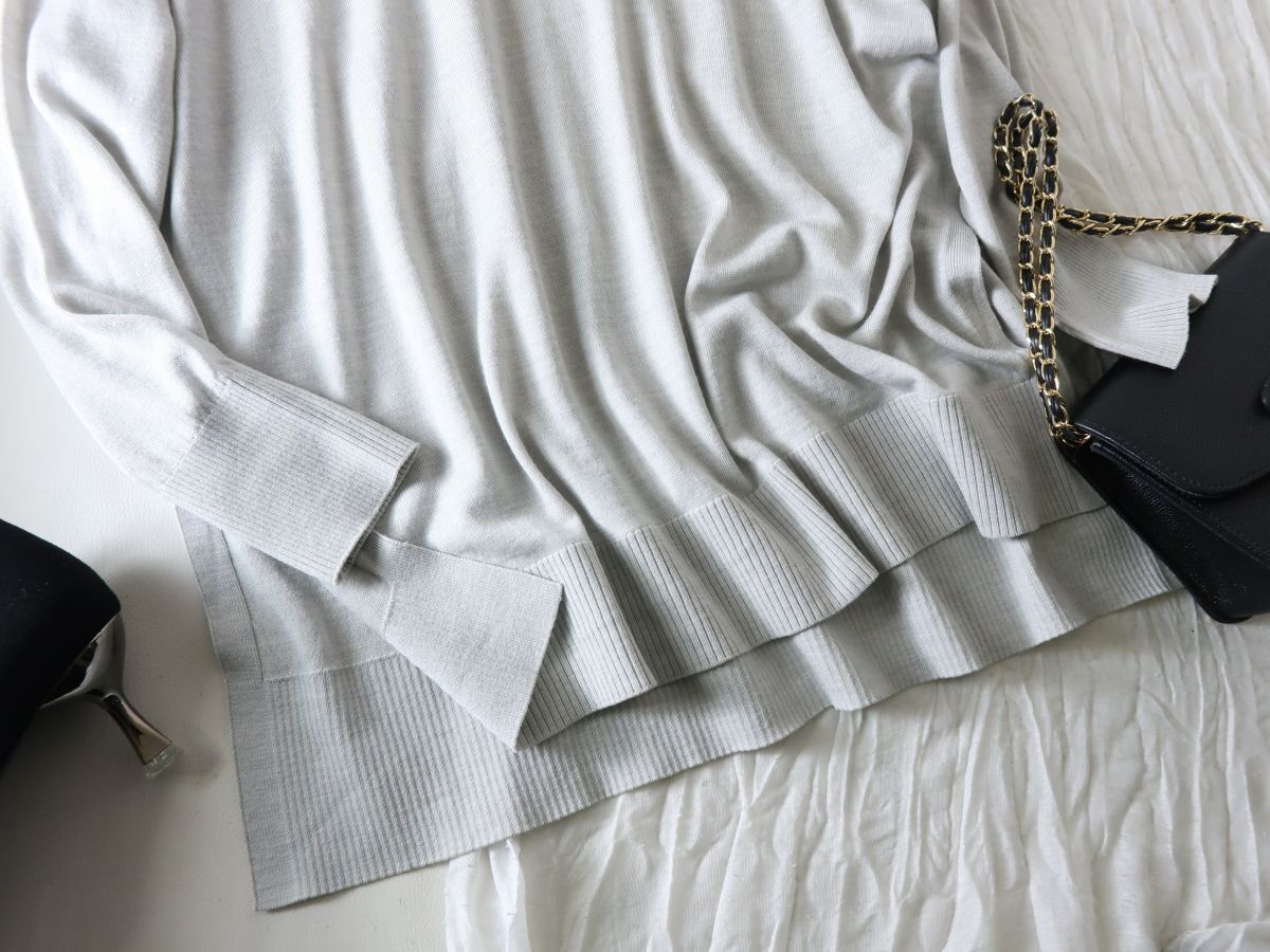 シルクを入れたことで上品な微光沢感があり、より滑らかな肌触りに仕上がっています。どんなボトムスとも相性がよく、キレイめスタイルもカジュアルスタイルにも重宝します。ロングスカートとのコーディネートもおすすめです。