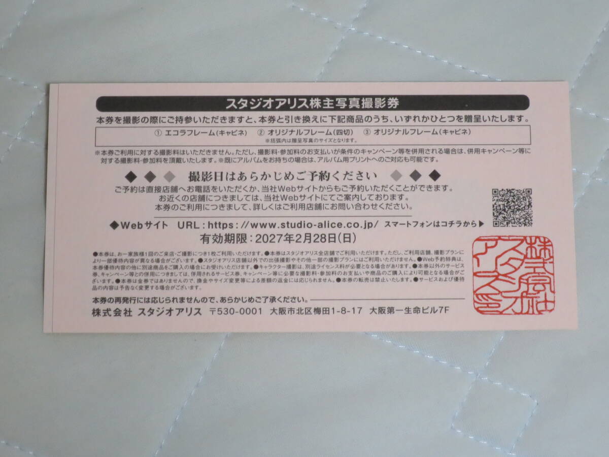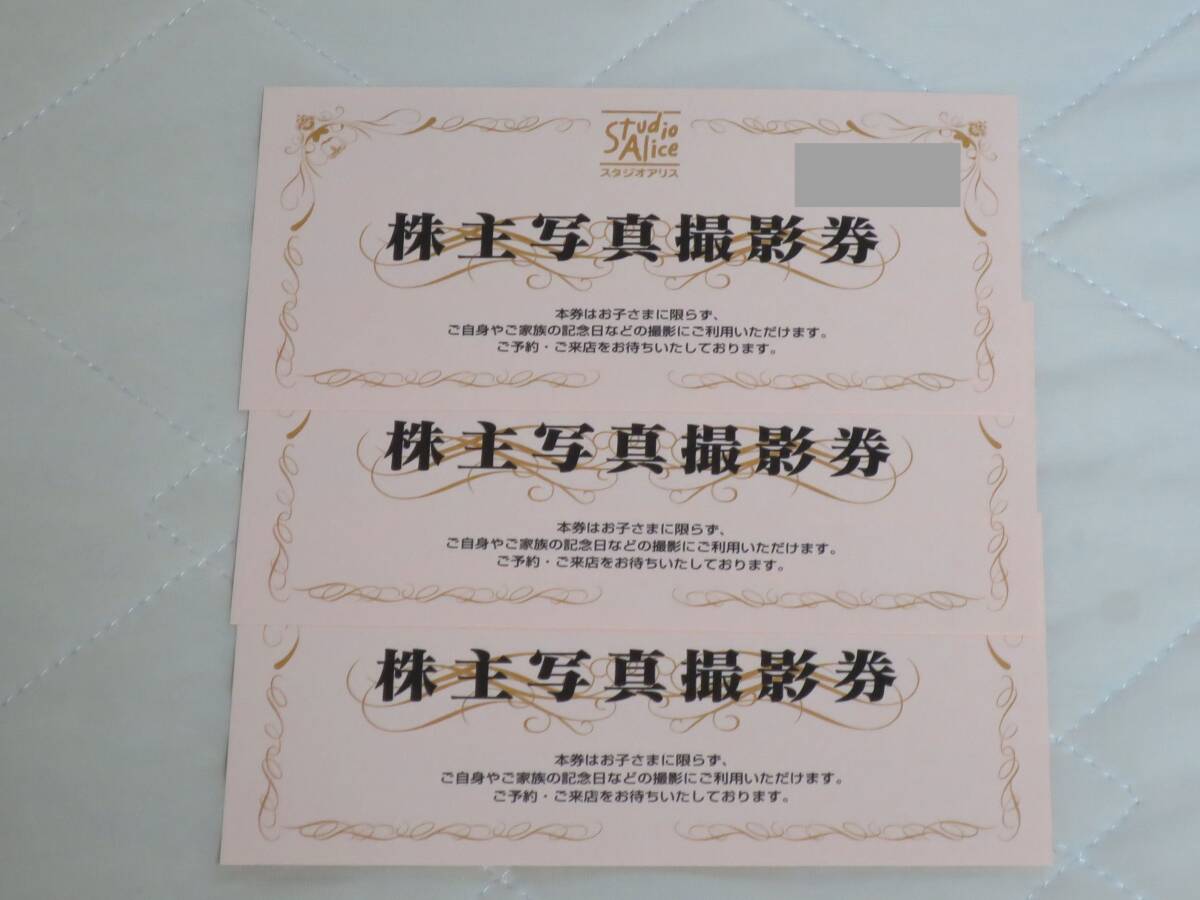 送料無料!★最新 スタジオアリス 優待 株主写真撮影券 3枚 2027年2月28日まで★(検)株主優待券/七五三/記念フォト