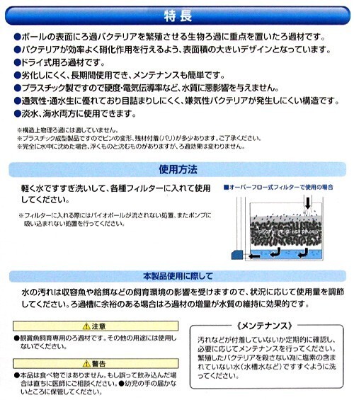 | 商品名:バイオボール12L用 2箱セット ドライ式ろ過はアンモニアの気化作用があり、 アンモニア・亜硝酸・硝酸の蓄積を減らすだけでなく、ろ過材に住む バクテリアに十分な酸素を供給し、ろ過能力は水中式ろ過の数倍にも なると言われてます。 ろ過槽の高さ確保や、ろ過立ち上げに時間が必要ですが、そのろ過能力の 高さから海水水槽や大型水槽のろ過に多く採用されています。 本品はバクテリアが効率良く硝化作用を行えるよう、表面積が大きく デザインされています。 ドライ式ろ過にお勧めのろ過材です。 通水性に優れた構造で、水質に悪影響を与えず、長期間使用できる高い 耐久性のろ過材です。 1個サイズ:直径約25mm 内容量:約1200個(12L)x2箱 淡水・海水両用 |