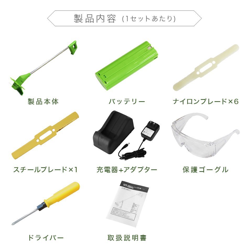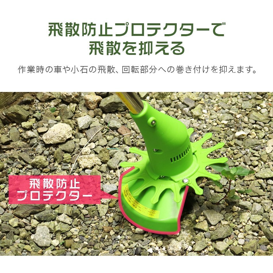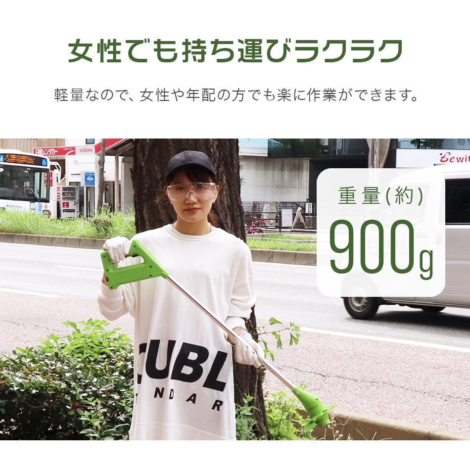 | 補助ローラー付きで片手でも楽々カンタン操作! 家庭で手軽にできるコンパクトな電動草刈機です。 安全フリープロテクター採用。 草刈り時の危険をしっかりガードできます! 用途に合わせて使い分けできる!2種類の刃が付属しています♪ ・「ナイロン刃」花壇やフェンスなどの障害物のある場所でも安全。 ・「スチール刃」硬い茎、枯れ草、太い茎はスチール刃でラクラクカット。 グリップは握りやすく、スイッチは誤動作防止の安全ロックレバー付き! さらに補助輪付きなので手で持ち上げたり、抱えながら作業する必要がありません。 安定して使用できます! バッテリーを含めても約1kgと軽量で、女性の方も楽に操作。 充電式なので電源コードも邪魔になりません。 【商品仕様】 サイズ(約):幅135×奥行200×全長930mm 重量(約):1000g ※バッテリー含む バッテリー:DC8.4Vリチウム電池2000mAh 充電時間(約):2時間 使用時間(約):30~40分 回転数(約):13000/分 刈込幅(約):120mm 材質:ABS樹脂、スチール 他 【商品内容】 本体 バッテリー 補助輪 ナイロン刃 ×6 スチール刃 ×1 専用充電器 ゴーグル ドライバー 日本版取扱説明書 |