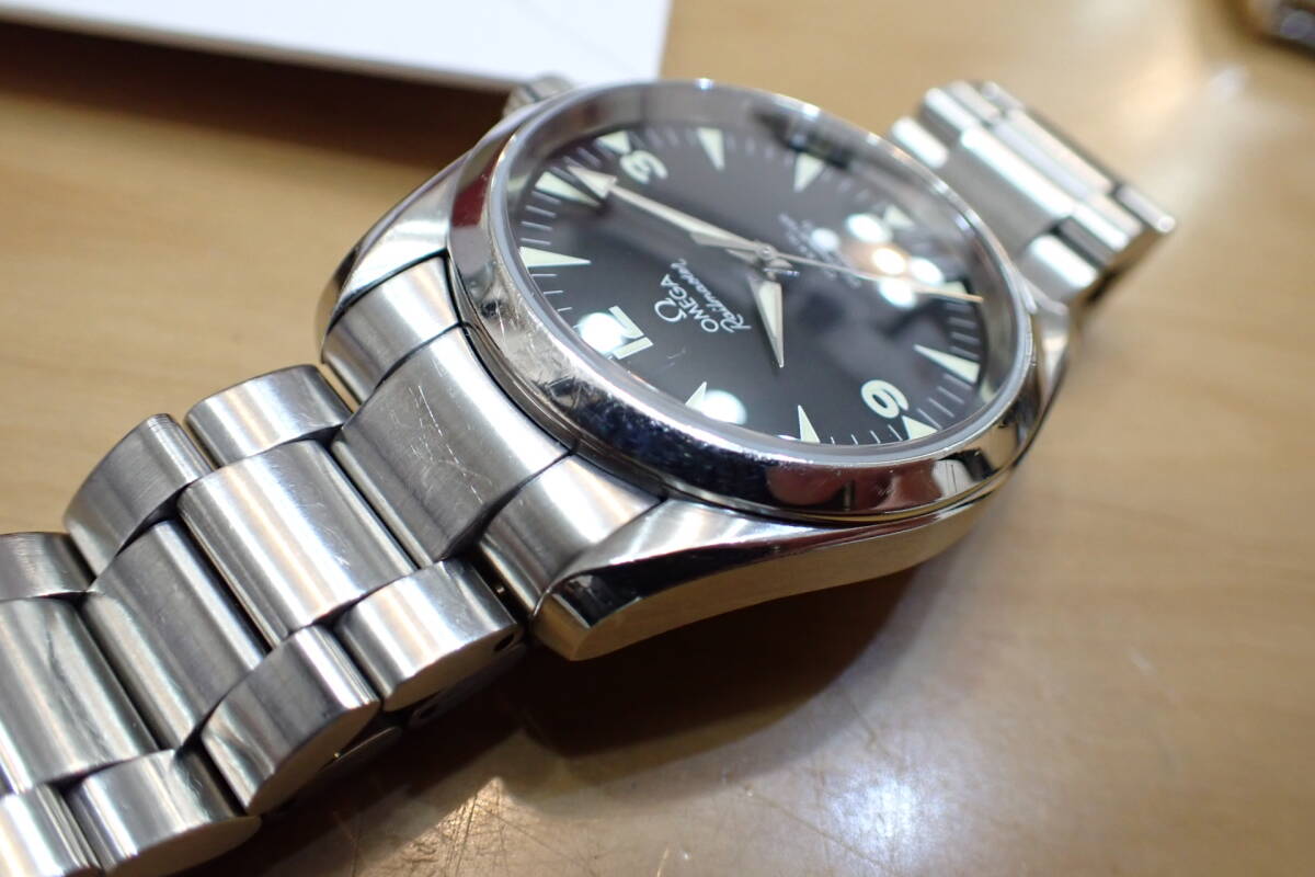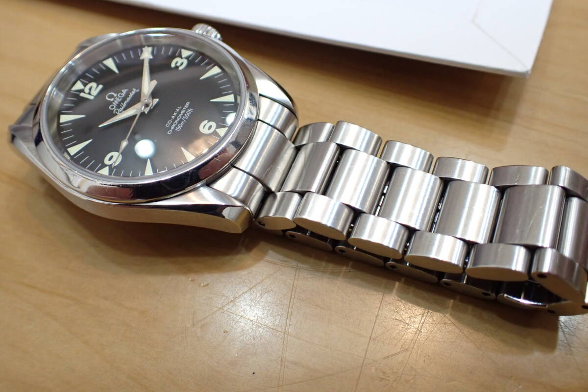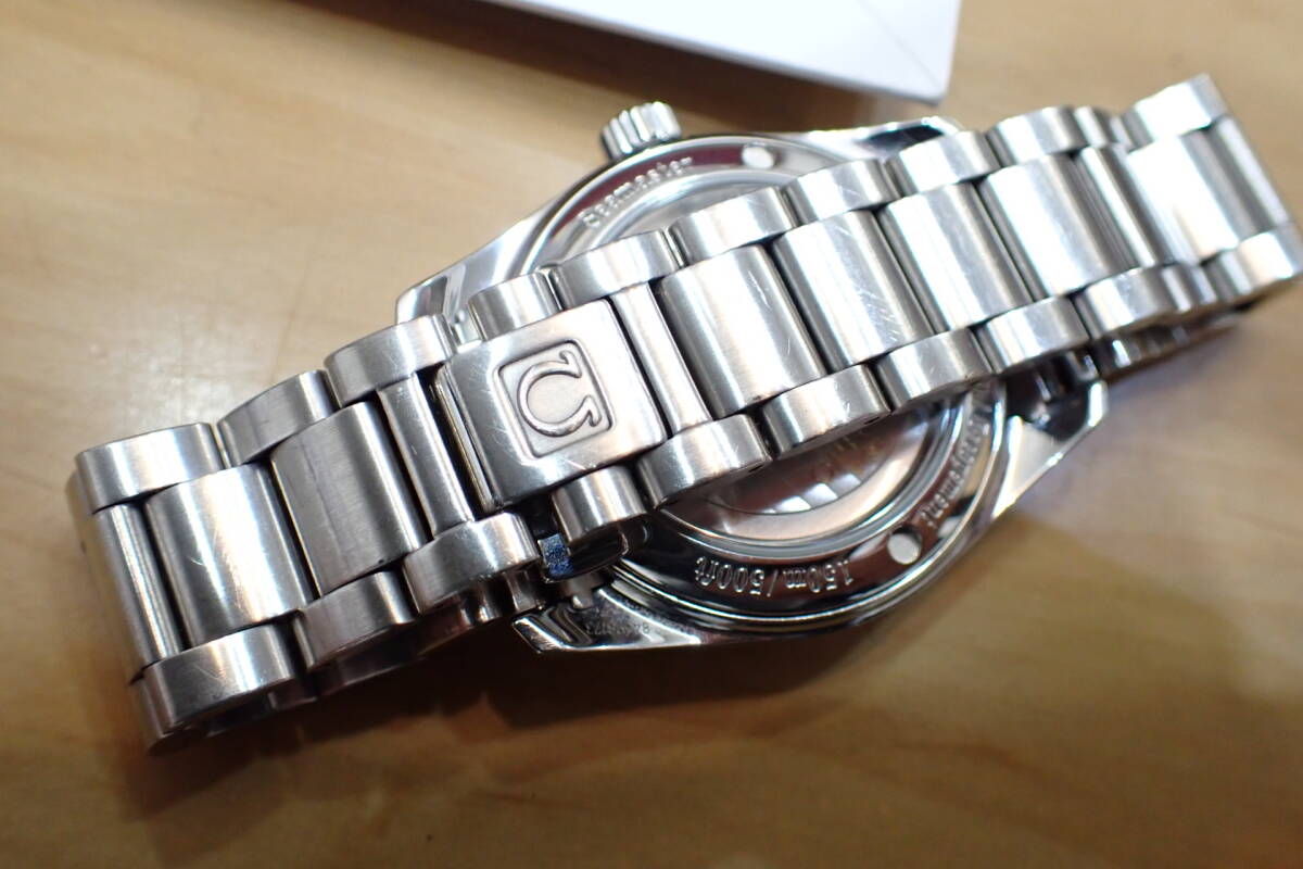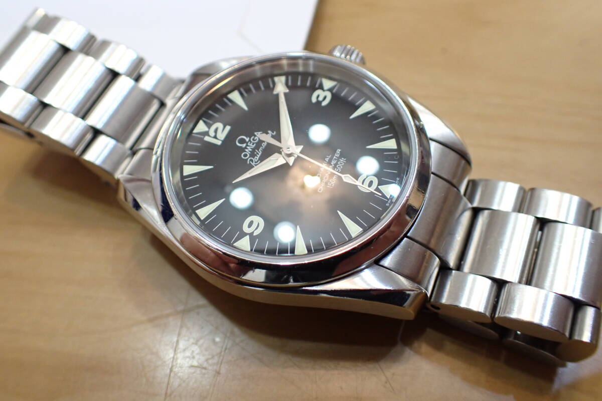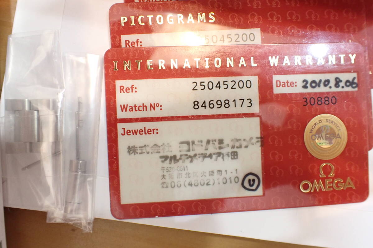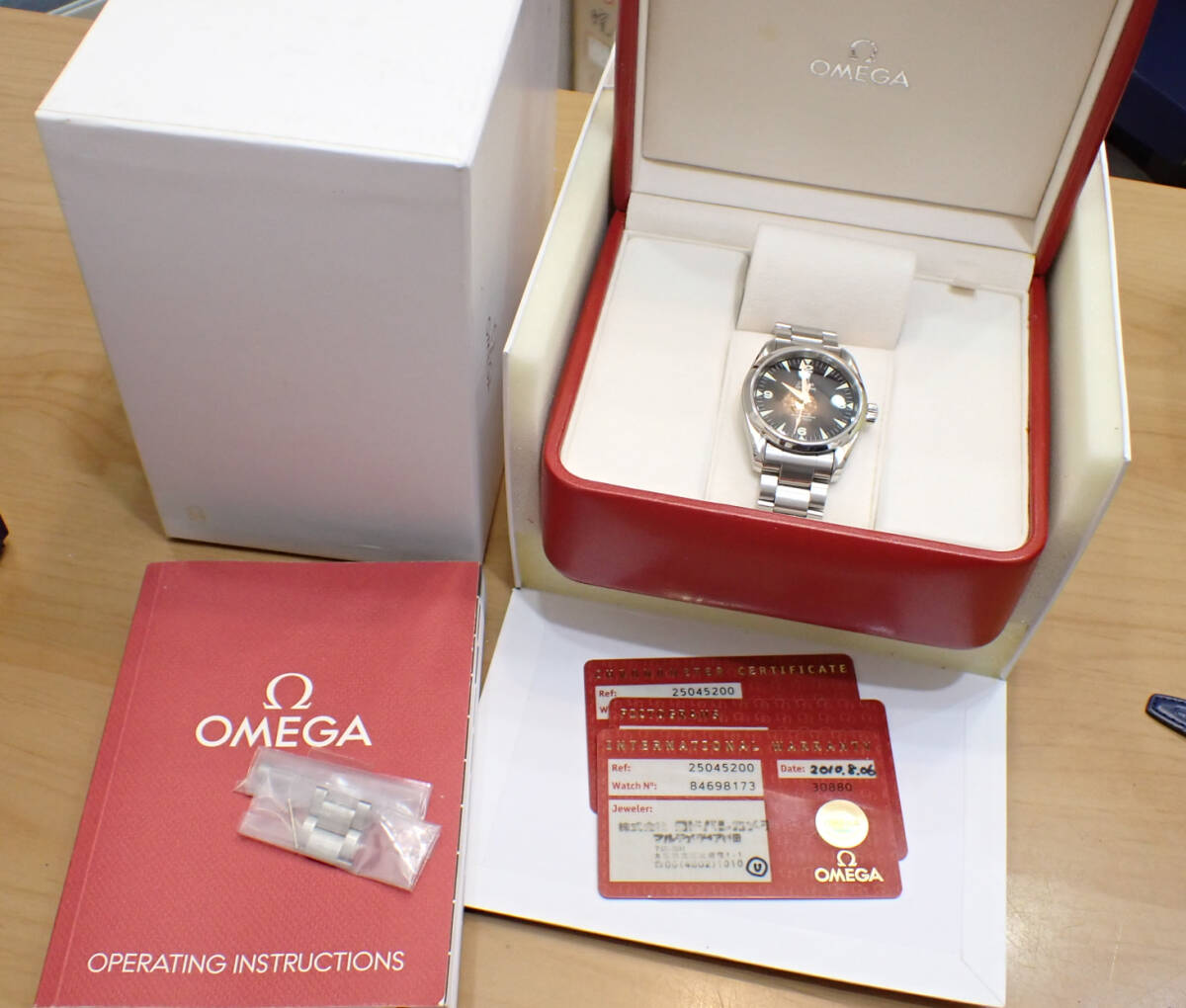 OMEGA/オメガ シーマスター アクアテラ レイルマスター 2504.52 コーアクシャル 黒文字盤 自動巻きメンズ腕時計です。 今では希少な廃版のレイルマスターのコーアクシャル・クロノメーターモデルです。 ヨドバシカメラにて2010年に購入の正規品です。 他の時計とローテーションで使用していました。 ケースやブレスレットに細かいスレがあります。 サファイアガラスや文字盤は綺麗です。 他、写真でご確認ください。 約7年程前に一度オーバーホールを行っていますが明細等はありません。 半日ほど見ても、カチカチと動いています。 それ以降、オーバーホールは行っていないので、オーバーホール前提でジャンクでお願いします。 外箱、内箱、説明書、ギャランティカード(2010年ヨドバシ)・コマ3個付きです。 ブレスレットは、フルコマかは不明ですが腕周り約19cmくらいまで対応できると思います。 ケース径:約36mm !オークション終了後、24時間以内に「お取引を始める」ボタンをクリックして、必ず取引をスタートして下さい。 取引のスタートが無ければ、削除させていただきます。 必ず厳守してください! 「新規ID」「直近で悪い評価が多い方」のトラブル(イタズラなど)が非常に多いです。 当方が、お取引に支障があると判断したID(特に新規ID)は削除します。 ●ジャンク品と記載の物の商品到着時の動作保証はありません。 ●付属品等は、写真に写っているものですべてです。 | ||||