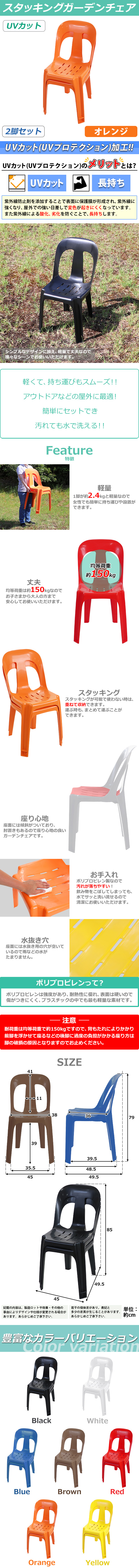 ●UVカット加工によって屋外での強い日差しで変色しにくくなっています。 ●紫外線による酸化、劣化を防ぐことにより、長持ちする作りになっています。 ●スタッキング構造なので重ねる事が可能なので、収納やまとめて運ぶ際にも大変便利です。 ●座面には水抜き穴が空いているので雨などの水がたまりません。 ●本体重量は約2.4kgと軽量タイプなので、女性でも軽々持ち運べます。 ●材質は、軽量、安全、防水のポリプロピレン(PP)です。 ●完成品なので届いたらすぐにお使いいただけます。 注意! 背もたれによりかかり前脚を浮かせて座るなどの後脚に過度の負担がかかる座り方は脚の破損の原因となりますのでお止めください。 ■重量:約2.4kg(1脚あたり) ■均等荷重:約150kg ■材質:PP[ポリプロピレン](本体) ●商品のカラーはオレンジとなります。 ●新品商品ではありますが、輸入商品の為、多少の擦り傷などがある場合がございますので、ご納得の上ご購入下さいませ。 ●ご購入後、お客様ご都合によるご返品、ご返金等は一切お受け致しておりません。 ●本商品を使用した際に発生したトラブル、事故につきまして、当社は一切の責任を負いません。ご使用に関しましては、全て自己責任にてお願い致します。 |