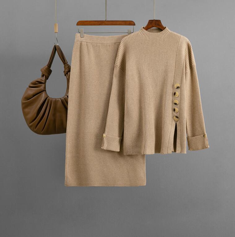 273 スカートスーツladiesレディース ◇ 綺麗めシルエット 人気◇  上下セット  ニット素材  カーキ
