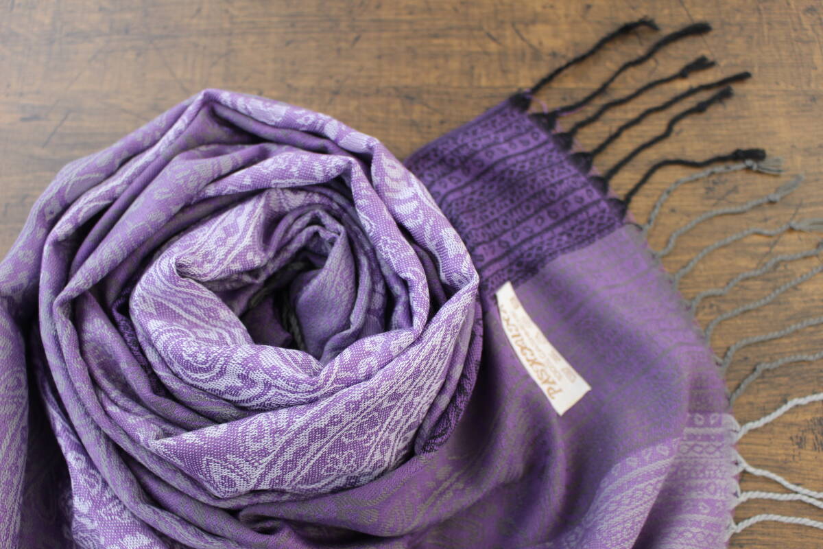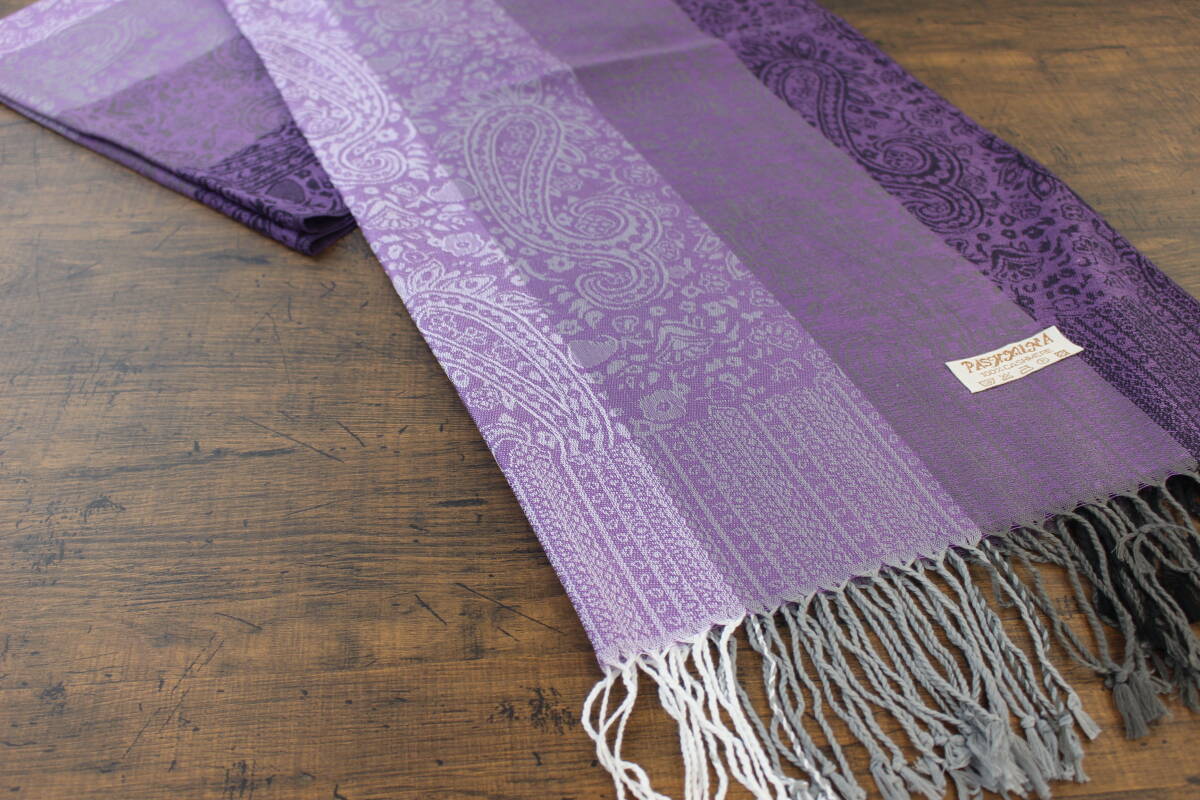 新品【パシュミナ Pashmina】ペイズリー柄 パープル系グラデーション 紫 PURPLE 大判 ストール カシミア100% Cashmere