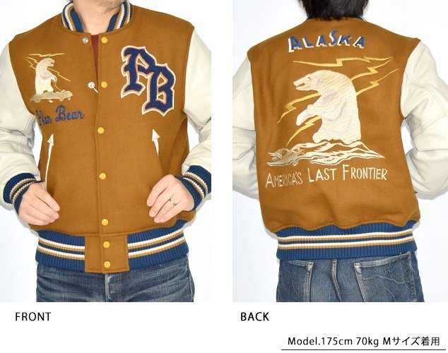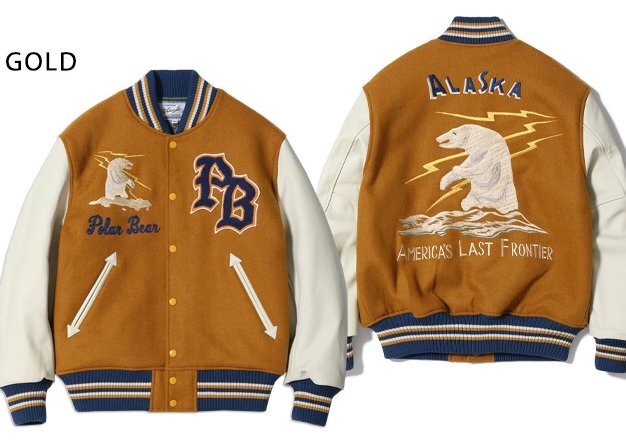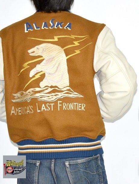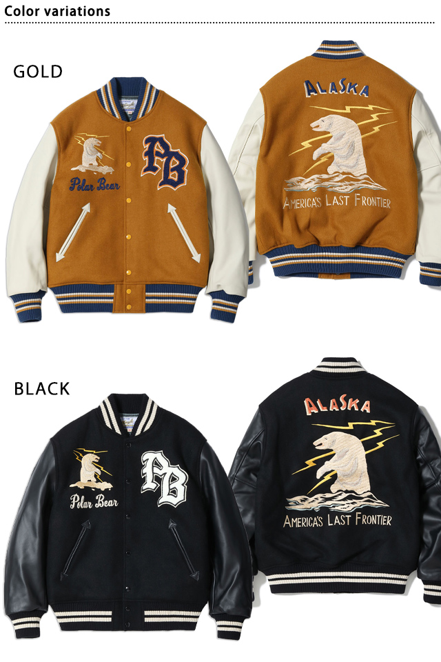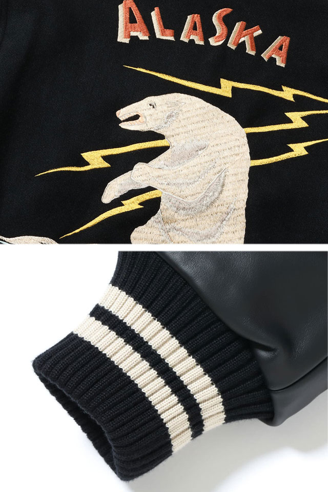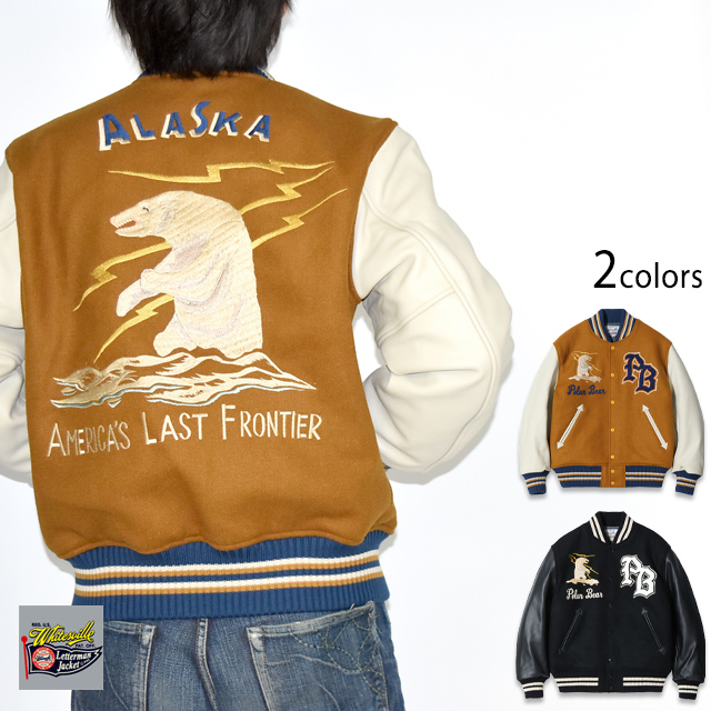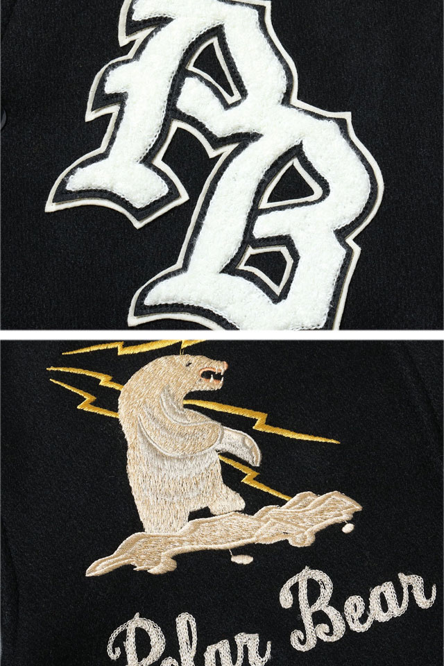 アメカジブランドWHITEVILLEから、30oz. WOOL MELTON AWARD JACKET /メルトンスタジアムジャンパー「POLAR BEAR」(WV15784)のご紹介です! 1950年代後期に港商商会(テーラー東洋の前身)が米軍からの依頼で製作し、アラスカ基地のPXで販売されていたスカジャンの絵柄。 中でもこの稲妻と白熊のデザインは評価が高い。ブラックで統一されたボディの中で、刺繍やシニール、リブのホワイトがアクセントとなったファッション性の高い一着に仕上がっています。 スカジャンで用いられる「横振り刺繍」やスタジャンで用いられる「サガラ刺繍」、ボウリングシャツで用いられる「チェーン刺繍」と、古き良き時代のありとあらゆる技術がこの一着に凝縮されています。 ホワイツビルのアワードジャケットは身頃に防寒性の高い30オンスのウールメルトン、袖には魅力的な経年変化をみせる米国産のステアハイドを使用。 ライニングはレーヨンコットンのキルティングとなっており、保温性に優れると共に袖入れがしやすく、快適な着心地を誇ります。 | ||||||||||||||||||||