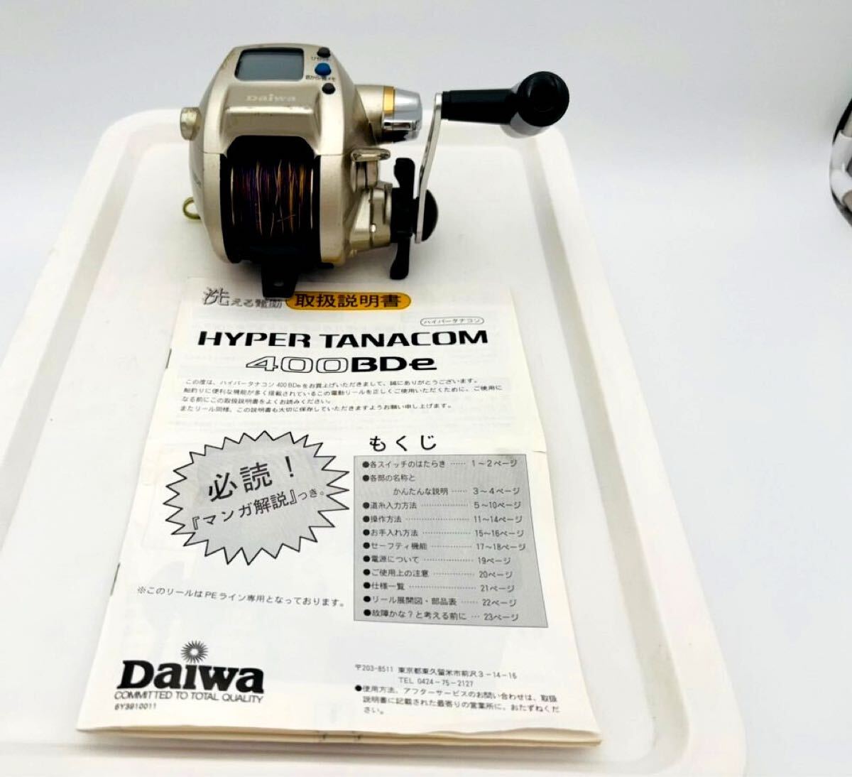 ダイワ ハイパータナコン 400 BDe です。 付属品は電源コードです。 機能や機関に問題ありません。 ※デジタル数字変化、クラッチ動作、レベルワインド動作確認しております。 取扱説明書なしの商品につきましては、釣具屋でメーカー取り寄せを希望すれば数百円で取り寄せ可能です。またメーカーホームページにて閲覧印刷も可能です。廃盤機種に関してはその限りではありませんのでご了承下さい。 他にも電動リールを出品しておりますので宜しくお願い致します。