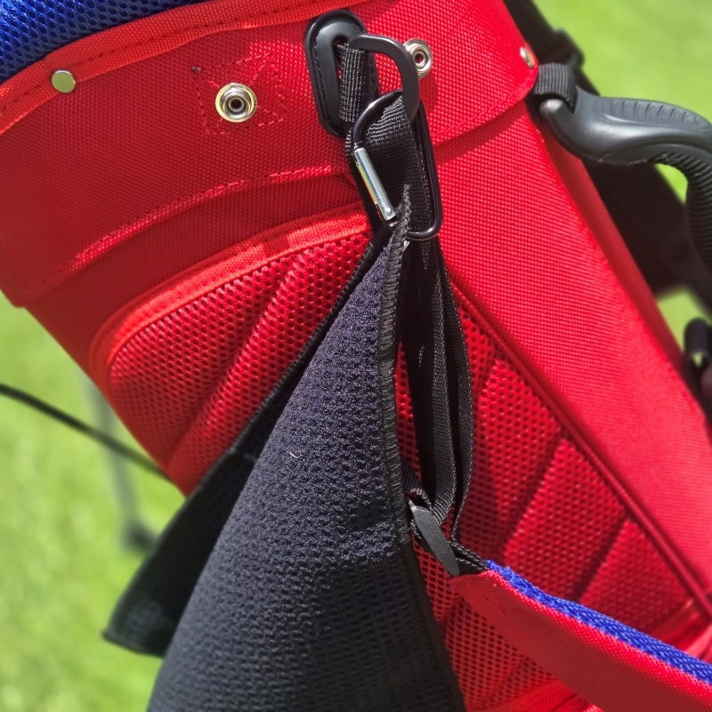 さびにくい軽量アルミ製。キャディーバッグ、ベルトループなどへワンタッチ装着。