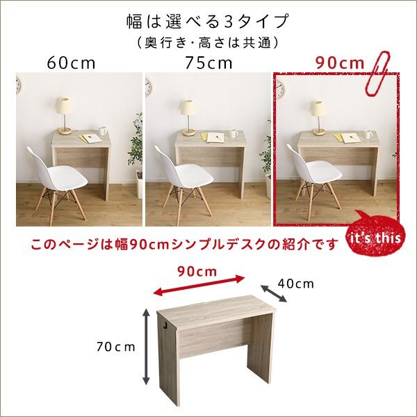 | 【ポイント】 子どもから大人まで使えるリビングに合うシンプルデスク90cm幅です。 教科書&ノートを広々置ける学習机に! 趣味や家事のワークスペースとしても使えます。 しっかりした厚みの天板はキズや書き跡に強いPVC仕様です。 デスクのサイドにはランドセルやバッグが掛けれるフック付きです。 デスクの背面にはライトやパソコンのコードを通せる隙間を作っているので、スッキリ収納できます。 |
