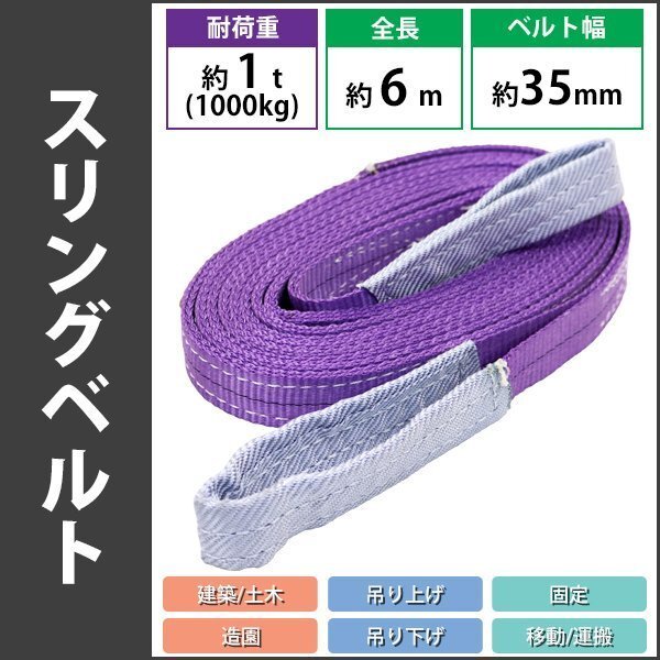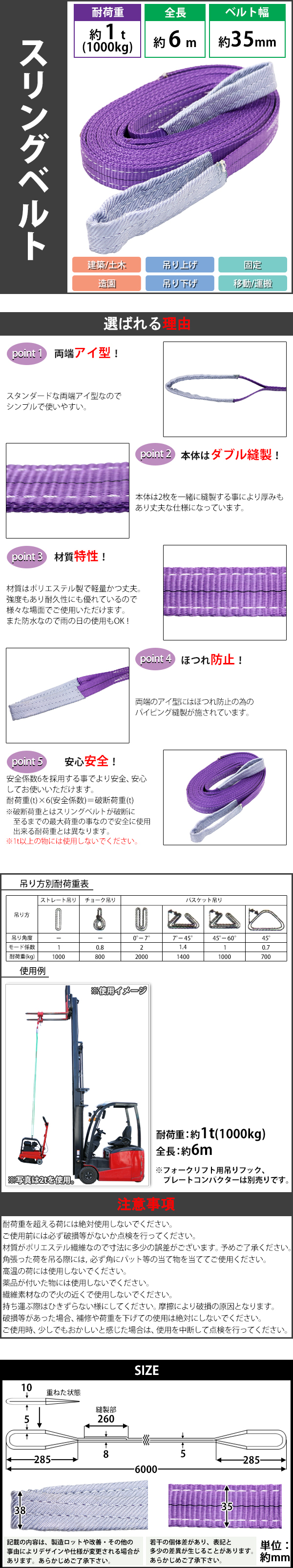 | 商品名 | 送料無料 スリングベルト ベルトスリング 耐荷重約1t 約1000kg 全長約6m ベルト幅約35mm 荷揚げ 吊り上げ 吊り下げ 玉掛け ナイロンスリング ナイロンスリングベルト 吊りベルト 繊維ベルト 建築 土木 造園 固定 運搬 引っ張り 牽引 紫 パープル slbelt1t6m |