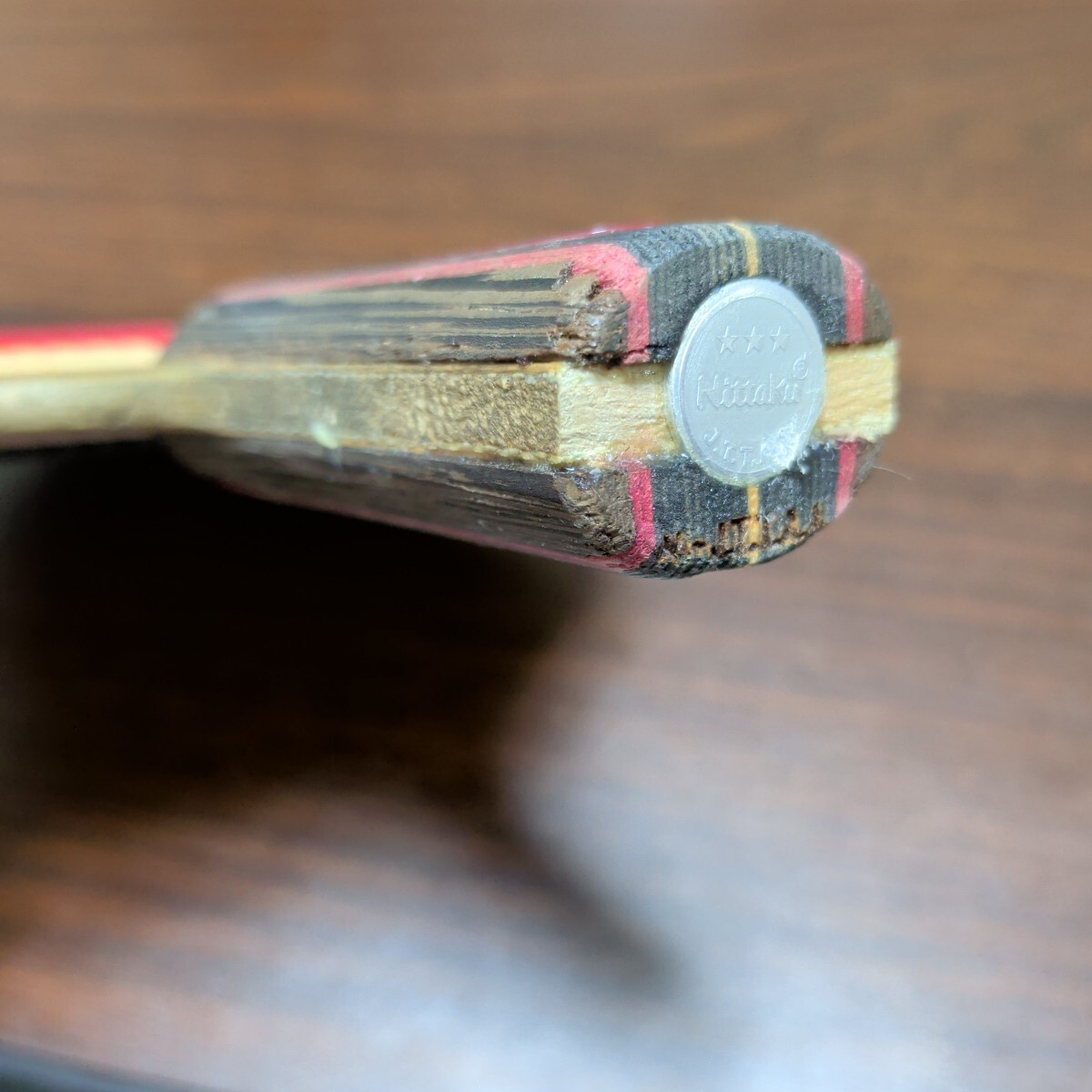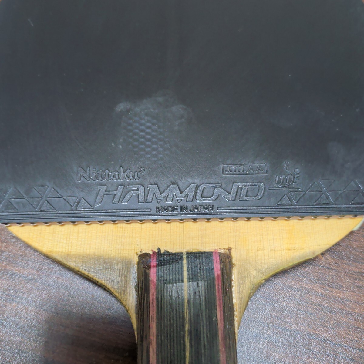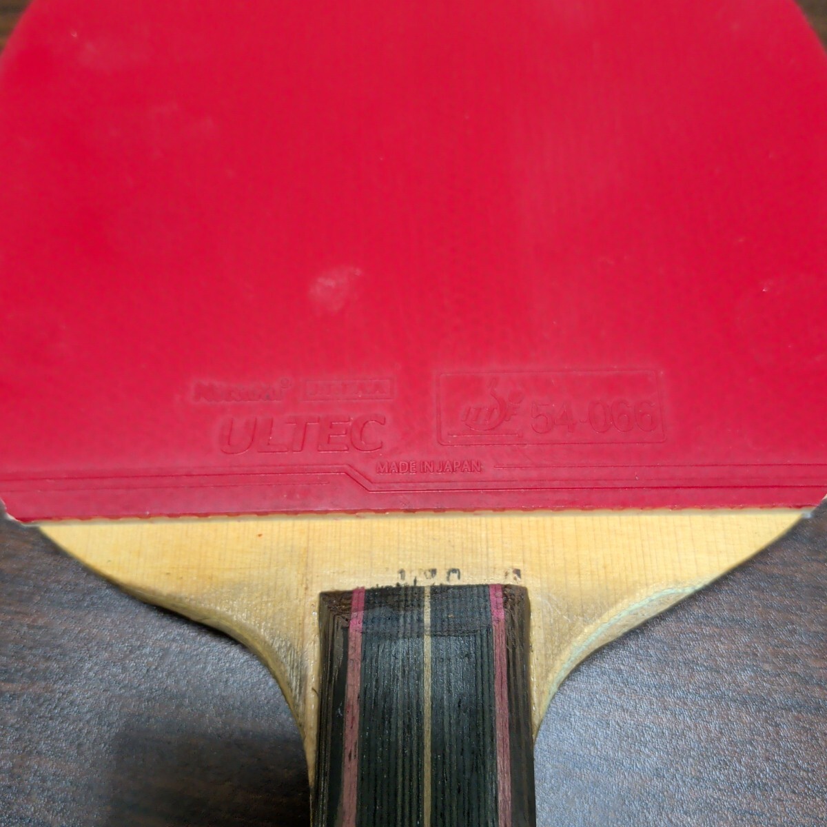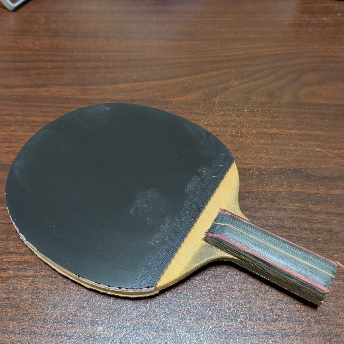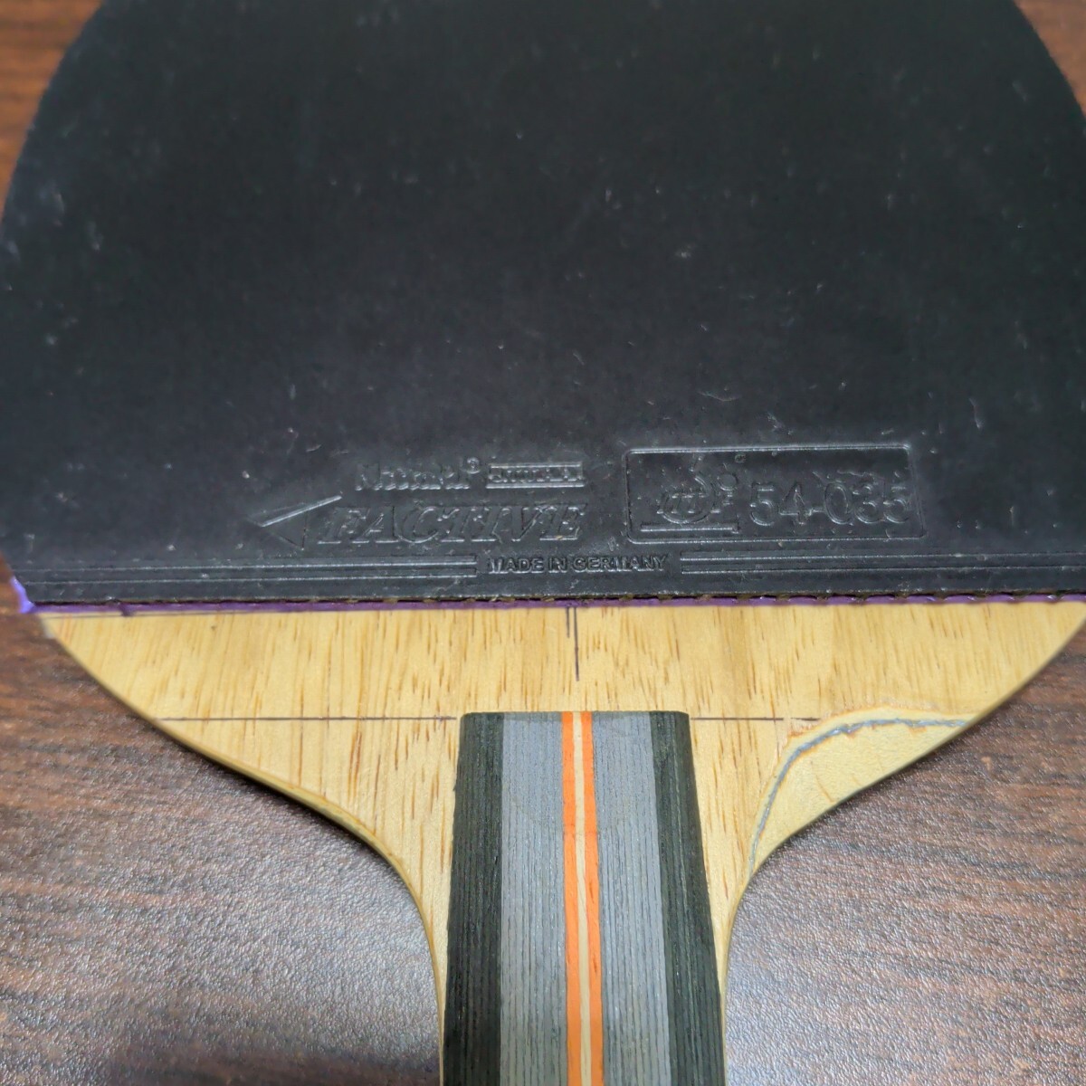 右利き用にグリップ削りがあります。貼ってあるラバーは数回使用した程度でまだ使えると思います。ラバー貼り付けのための線が引いてあります。